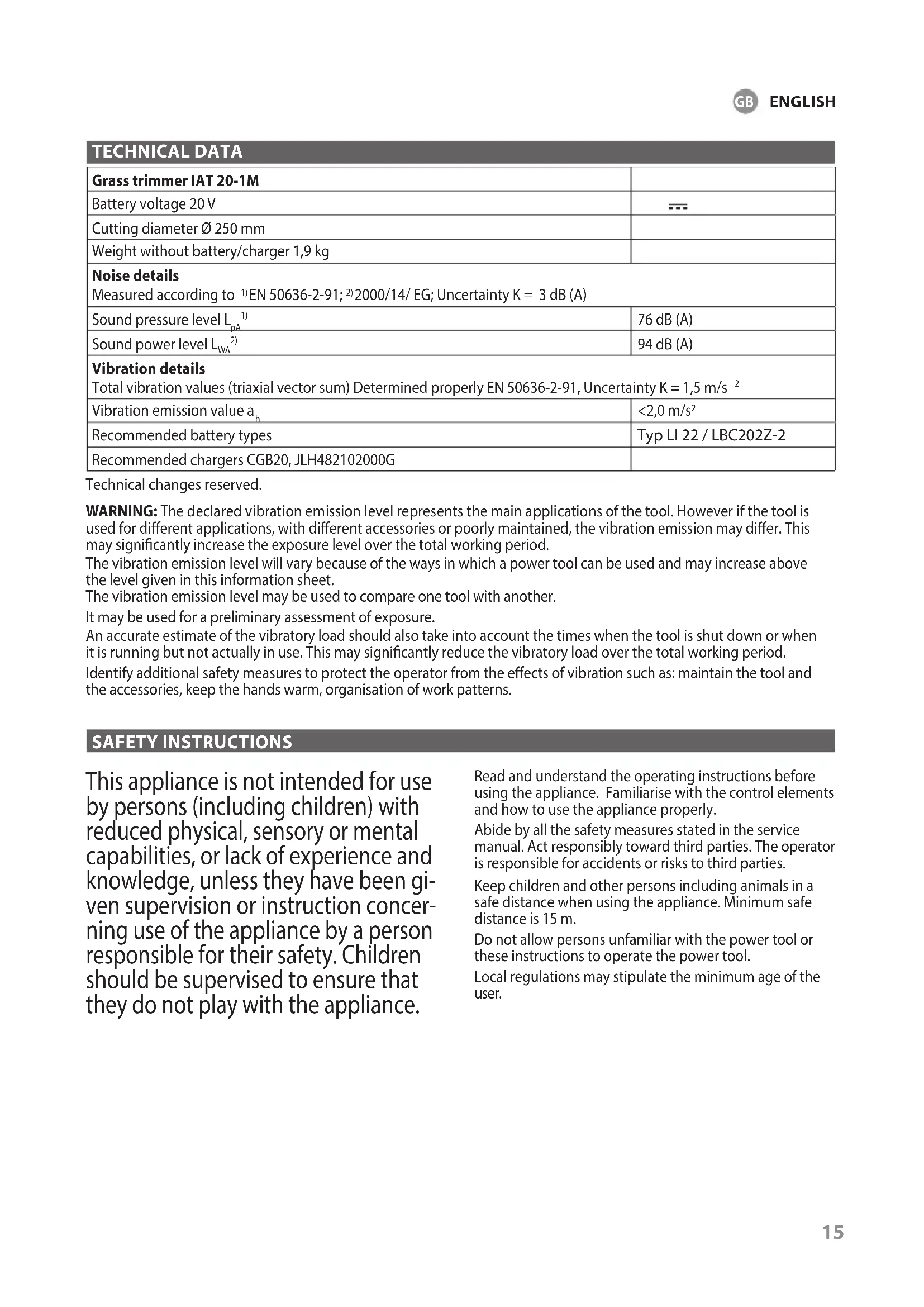 used for dierent applications, with dierent accessories or poorly maintained, the vibration emission may dier. This may signicantly increase the exposure level over the total working period. The vibration emission level will vary because of the ways in which a power tool can be used and may increase above the level given in this information sheet. The vibration emission level may be used to compare one tool with another. It may be used for a preliminary assessment of exposure. An accurate estimate of the vibratory load shouldalso take into account the times when the tool isshut down or when it is running but not actually inuse. This may signicantly reduce the vibratoryload over the total working period. Identify additional safety measures to protect theoperator from the eects of vibration such as:maintain the tool and the accessories, keep thehands warm, organisation of work patterns. SAFETY INSTRUCTIONS This appliance is not intended for use by persons (including children) with reduced physical, sensory or mental capabilities, or lack of experience and knowledge, unless they have been gi- ven supervision or instruction concer- ning use of the appliance by a person responsible for their safety. Children should be supervised to ensure that they do not play with the appliance. Read and understand the operating instructions before using the appliance. Familiarise with the control elements and how to use the appliance properly. Abide by all the safety measures stated in the service manual. Act responsibly toward third parties. The operator is responsible for accidents or risks to third parties. Keep children and other persons including animals in a safe distance when using the appliance. Minimum safe distance is 15 m. Do not allow personsunfamiliar with the power tool or these instructions to operate the power tool. Local regulations may stipulate the minimum age of the user.