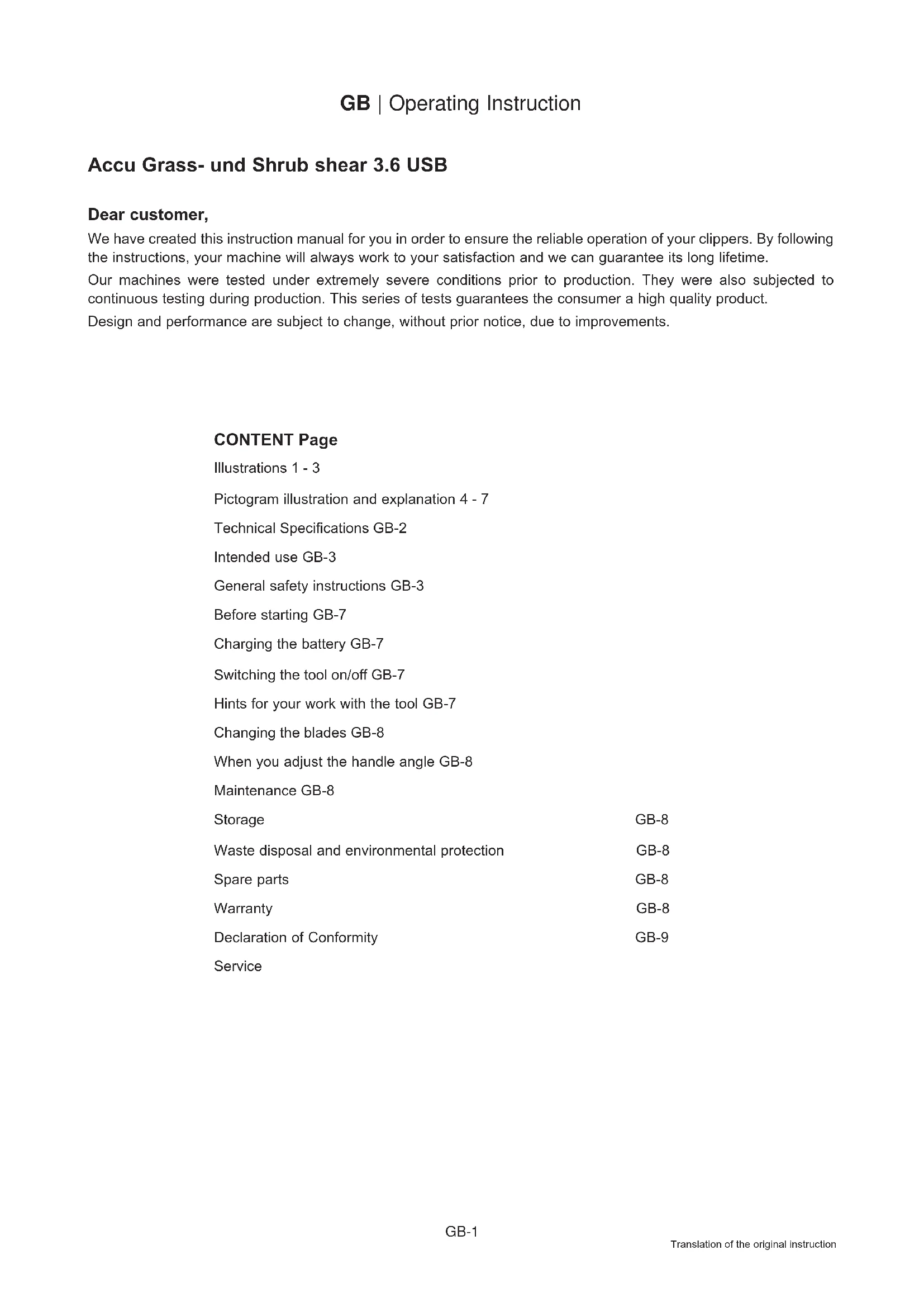 - Grass trimmer ** Shrub trimmer - The specied vibration emission value was measured by a standardized test methods and can compare with other power tools are used. - The specied vibration emission value can also be necessary for the assessment of work breaks are used. - The specied vibration emission value can vary during the actual use of the electric tool by specifying the value, depending on the way how to use the power tool. - Note: You create the privilege against vascular pulsations of the hands in time breaks. - Try to keep the stress due to vibration as low as possible. For example, measures to reduce vibration stress are wearing gloves when using the tool and limiting the work time. All phase of the operating cycle must be considered in this regard, (for example, times when the power tool is switched o, and times when the power tool is switched on but is not running under load). - Always keep hands and feet away from the cutting tools, particularly when switching on the motor! Accu Grass- and Shrub shear IGBS 3.6 USB GB-2GB | Operating Instruction Attention: Noise protection! Please observe the local regulations when operating your de- vice Intended use As required, this device may be converted via simple re- placement of the included attachments into grass shears or bush shears. Hints for your work with the tool The shrub trimmer cuts ornamental shrubs and light undergrowth or bushes. The device is also well-suited for ornamental cuts as, for example, for the care of graves. The battery-powered grass and shrub shear can not and should not replace your hedge shears. They are exclusively designed to trim and cut back ornamental shrubs and brush- wood with a low wood thickness. Any other use is not deemed appropriate and the manufacturer/ supplier is not liable for damages resulting from such use. Please note that our equipment has not been designed for use in commercial, trade or industrial applications. Our warranty will be voided if the machine is used in commercial, trade or industrial businesses or for equiv- alent purposes. Important! It is prohibited to use the tool to chop material for composting because of the potential danger to per- sons and property. The grass shears allow for clean cuts of lawn edges or hardly accessible lawn areas. Each type of use other than those given in these in- structions for use can damage the machine and cause serious risk to the user. Please always observe the safety instructions in order to safeguard your guarantee claim and in the interests of product safety. Due to the machine’s design, we are unable to fully exclude all residual risks. Residual dangers Residual risks always remain even if the hedge trimmer is used properly. The hedge trimmer‘s design can entail the following hazards: