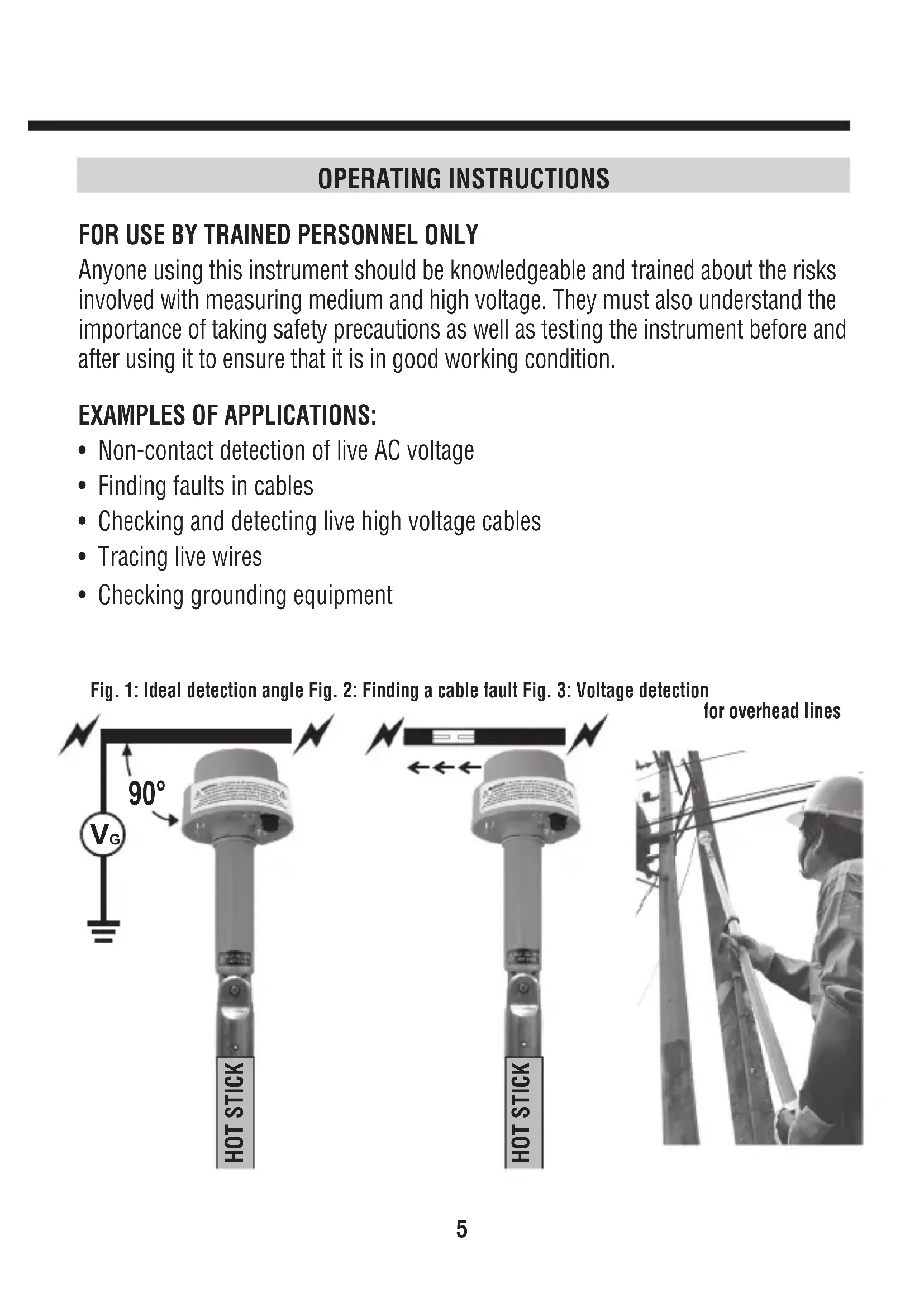 and listen for a beeping sound. See Fig. 1 on page 5 for ideal detection angle. Always test on known live circuit to verify tester functionality prior to use. If the 3 red LEDs do not glow and the beep sound is not present, replace batteries. OPERATION Before using the unit, a hot stick must be attached. Only use with hot sticks and rubber gloves meeting industry standards. Always follow approved work safety practices and clearances per OSHA Sub-parts R & V and all company work rules. Turn the sensitivity selector knob