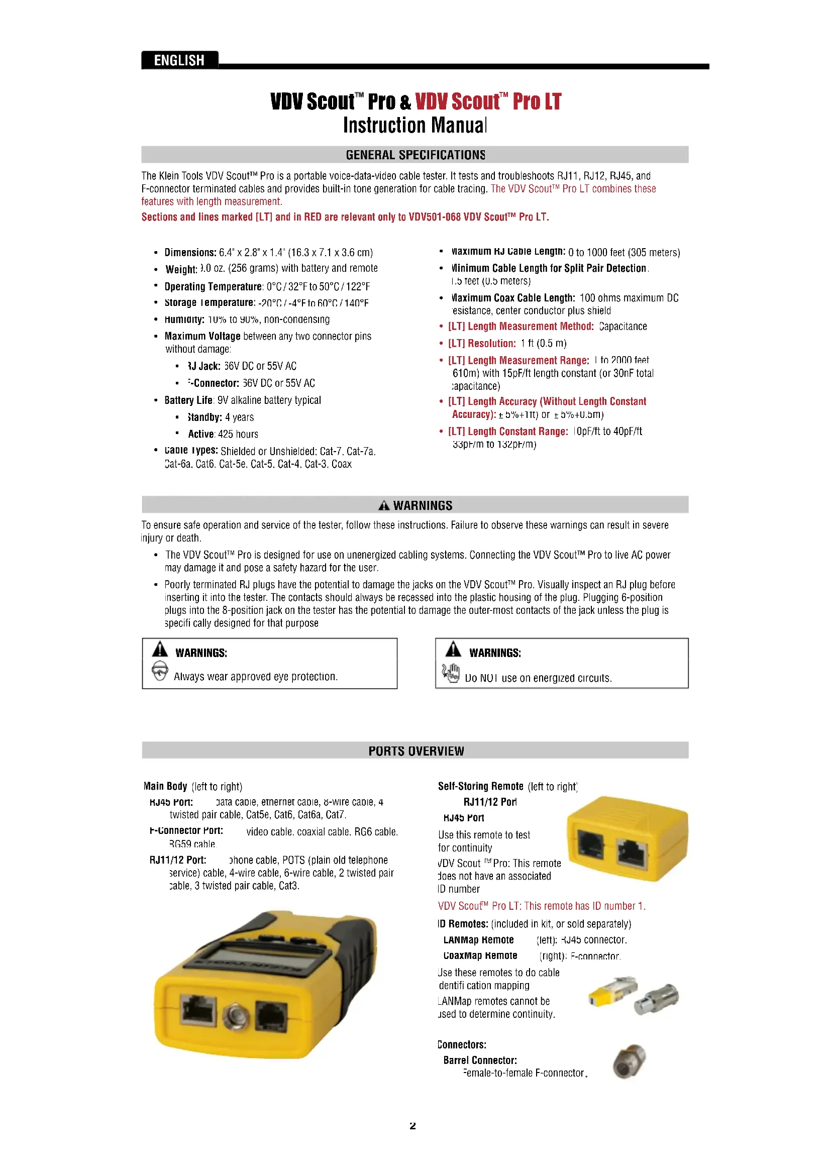 Instruction Manual GENERAL SPECIFICATIONS The Klein Tools VDV Scout™ Pro is a portable voice-data-video cable tester. It tests and troubleshoots RJ11, RJ12, RJ45, and F-connector terminated cables and provides built-in tone generation for cable tracing. The VDV Scout™ Pro LT combines these features with length measurement.Sections and lines marked [LT] and in RED are relevant only to VDV501-068 VDV Scout™ Pro LT. PORTS OVERVIEW Self-Storing Remote (left to right) RJ11/12 Port RJ45 Port Use this remote to test for continuity. VDV Scout