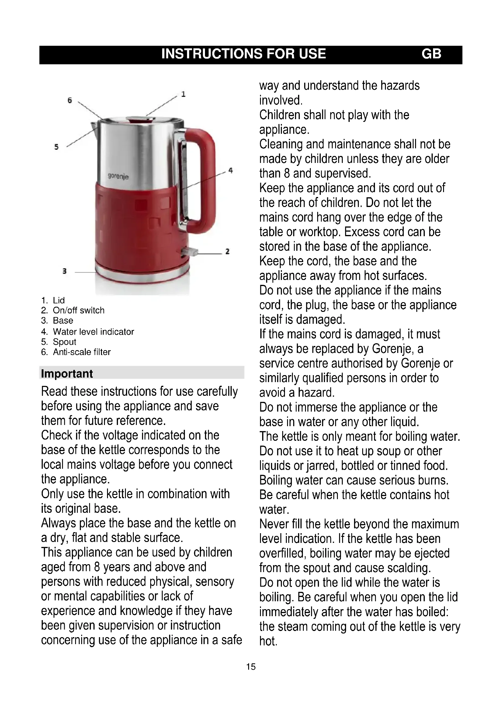 Important Read these instructions for use carefully before using the appliance and save them for future reference. Check if the voltage indicated on the base of the kettle corresponds to the local mains voltage before you connect the appliance. Only use the kettle in combination with its original base. Always place the base and the kettle on a dry, flat and stable surface. This appliance can be used by children aged from 8 years and above and persons with reduced physical, sensory or mental capabilities or lack of experience and knowledge if they have been given supervision or instruction concerning use of the appliance in a safe way and understand the hazards involved. Children shall not play with the appliance. Cleaning and maintenance shall not be made by children unless they are older than 8 and supervised. Keep the appliance and its cord out of the reach of children. Do not let the mains cord hang over the edge of the table or worktop. Excess cord can be stored in the base of the appliance. Keep the cord, the base and the appliance away from hot surfaces. Do not use the appliance if the mains cord, the plug, the base or the appliance itself is damaged. If the mains cord is damaged, it must always be replaced by Gorenje, a service centre authorised by Gorenje or similarly qualified persons in order to avoid a hazard. Do not immerse the appliance or the base in water or any other liquid. The kettle is only meant for boiling water. Do not use it to heat up soup or other liquids or jarred, bottled or tinned food. Boiling water can cause serious burns. Be careful when the kettle contains hot water. Never fill the kettle beyond the maximum level indication. If the kettle has been overfilled, boiling water may be ejected from the spout and cause scalding. Do not open the lid while the water is boiling. Be careful when you open the lid immediately after the water has boiled: the steam coming out of the kettle is very hot.16 Avoid touching the body of the kettle, as it gets very hot during use. Always lift the kettle by its handle. Always make sure the water in the kettle at least covers the bottom of the kettle to prevent the kettle from boiling dry. Some condensation may appear on the base of the kettle. This is perfectly normal and does not mean that the kettle has any defects. Depending on the hardness of the water in your area, small spots may appear on the heating element of your kettle when you use it. This phenomenon is the result of scale build-up on the heating element and on the inside of the kettle over time. The harder the water, the faster scale will build up. Scale can occur in different colours. Although scale is harmless, too much scale can influence the performance of your kettle. Descale your kettle regularly by following the instructions given in the chapter ‘Descaling’. Electromagnetic fields (EMF) This Gorenje appliance complies with all standards regarding electromagnetic fields (EMF). If handled properly and according to the instructions in this user manual, the appliance is safe to use based on scientific evidence available today. This appliance is marked according to the European directive 2012/19/EU on Waste Electrical and Electronic Equipment (WEEE). This guideline is the frame of a European- wide validity of return and recycling on Waste Electrical and Electronic Equipment. Boil-dry protection This kettle is equipped with boil-dry protection. This device will automatically switch the kettle off if it is accidentally switched on when there is no water or not enough water in it. The on/off switch will stay in ‘on’ position, but the power-on light ring will go out. Set the on/off switch to ‘off ’ and let the kettle cool down for 10 minutes. Then lift the kettle from its base to reset the boil-dry protection. The kettle is now ready for use again. Before first use