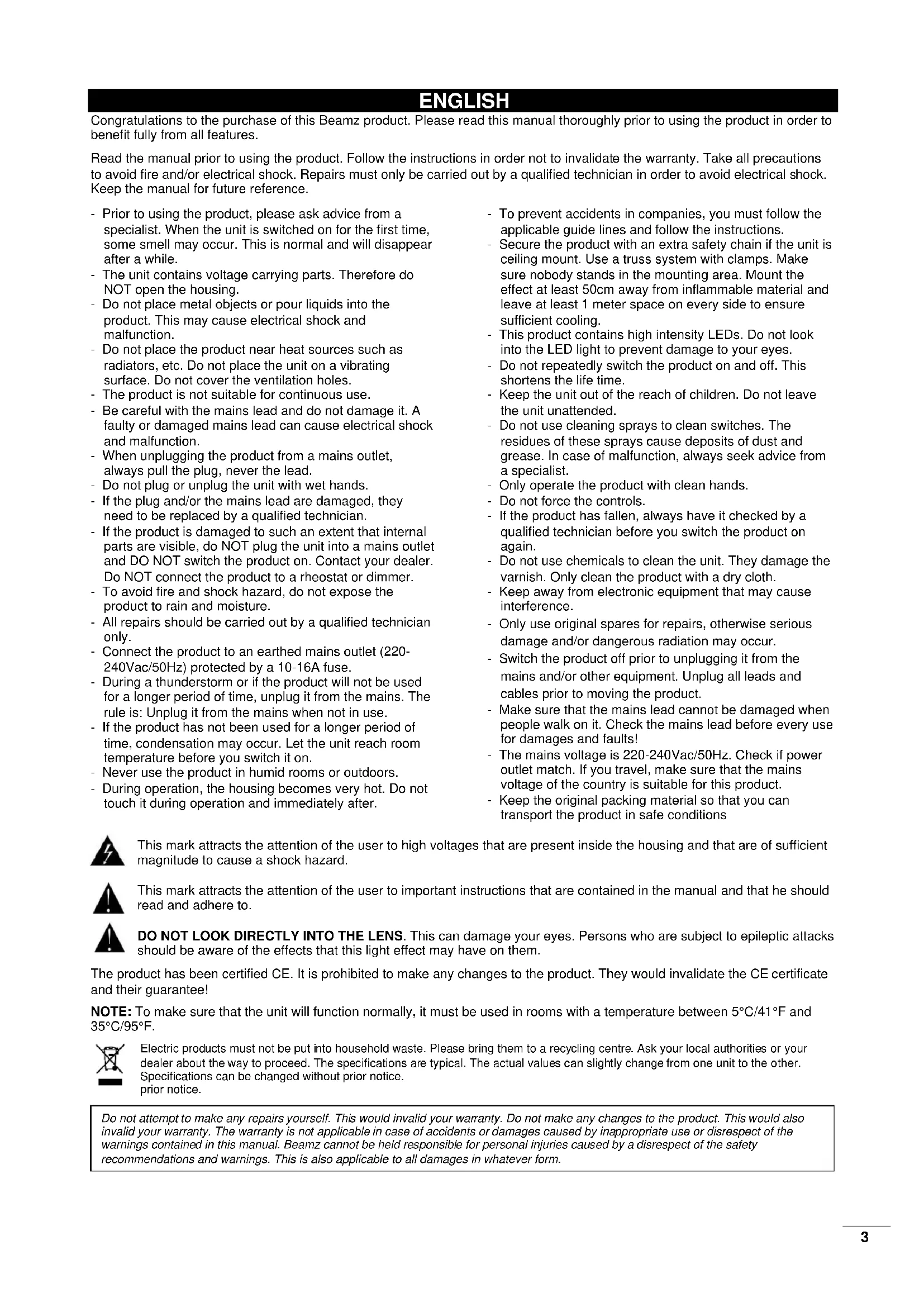 V1.223 ENGLISH Congratulations to the purchase of this Beamz product. Please read this manual thoroughly prior to using the product in order to benefit fully from all features. Read the manual prior to using the product. Follow the instructions in order not to invalidate the warranty. Take all precautions to avoid fire and/or electrical shock. Repairs must only be carried out by a qualified technician in order to avoid electrical shock. Keep the manual for future reference. - Prior to using the product, please ask advice from a specialist. When the unit is switched on for the first time, some smell may occur. This is normal and will disappear after a while. - The unit contains voltage carrying parts. Therefore do NOT open the housing. - Do not place metal objects or pour liquids into the product. This may cause electrical shock and malfunction. - Do not place the product near heat sources such as radiators, etc. Do not place the unit on a vibrating surface. Do not cover the ventilation holes. - The product is not suitable for continuous use. - Be careful with the mains lead and do not damage it. A faulty or damaged mains lead can cause electrical shock and malfunction. - When unplugging the product from a mains outlet, always pull the plug, never the lead. - Do not plug or unplug the unit with wet hands. - If the plug and/or the mains lead are damaged, they need to be replaced by a qualified technician. - If the product is damaged to such an extent that internal parts are visible, do NOT plug the unit into a mains outlet and DO NOT switch the product on. Contact your dealer. Do NOT connect the product to a rheostat or dimmer. - To avoid fire and shock hazard, do not expose the product to rain and moisture. - All repairs should be carried out by a qualified technician only. - Connect the product to an earthed mains outlet (220- 240Vac/50Hz) protected by a 10-16A fuse. - During a thunderstorm or if the product will not be used for a longer period of time, unplug it from the mains. The rule is: Unplug it from the mains when not in use. - If the product has not been used for a longer period of time, condensation may occur. Let the unit reach room temperature before you switch it on. - Never use the product in humid rooms or outdoors. - During operation, the housing becomes very hot. Do not touch it during operation and immediately after. - To prevent accidents in companies, you must follow the applicable guide lines and follow the instructions. - Secure the product with an extra safety chain if the unit is ceiling mount. Use a truss system with clamps. Make sure nobody stands in the mounting area. Mount the effect at least 50cm away from inflammable material and leave at least 1 meter space on every side to ensure sufficient cooling. - This product contains high intensity LEDs. Do not look into the LED light to prevent damage to your eyes. - Do not repeatedly switch the product on and off. This shortens the life time. - Keep the unit out of the reach of children. Do not leave the unit unattended. - Do not use cleaning sprays to clean switches. The residues of these sprays cause deposits of dust and grease. In case of malfunction, always seek advice from a specialist. - Only operate the product with clean hands. - Do not force the controls. - If the product has fallen, always have it checked by a qualified technician before you switch the product on again. - Do not use chemicals to clean the unit. They damage the varnish. Only clean the product with a dry cloth. - Keep away from electronic equipment that may cause interference. - Only use original spares for repairs, otherwise serious damage and/or dangerous radiation may occur. - Switch the product off prior to unplugging it from the mains and/or other equipment. Unplug all leads and cables prior to moving the product. - Make sure that the mains lead cannot be damaged when people walk on it. Check the mains lead before every use for damages and faults! - The mains voltage is 220-240Vac/50Hz. Check if power outlet match. If you travel, make sure that the mains voltage of the country is suitable for this product. - Keep the original packing material so that you can transport the product in safe conditions This mark attracts the attention of the user to high voltages that are present inside the housing and that are of sufficient magnitude to cause a shock hazard. This mark attracts the attention of the user to important instructions that are contained in the manual and that he should read and adhere to. DO NOT LOOK DIRECTLY INTO THE LENS. This can damage your eyes. Persons who are subject to epileptic attacks should be aware of the effects that this light effect may have on them. The product has been certified CE. It is prohibited to make any changes to the product. They would invalidate the CE certificate and their guarantee! NOTE: To make sure that the unit will function normally, it must be used in rooms with a temperature between 5°C/41°F and 35°C/95°F. Electric products must not be put into household waste. Please bring them to a recycling centre. Ask your local authorities or your dealer about the way to proceed. The specifications are typical. The actual values can slightly change from one unit to the other. Specifications can be changed without prior notice. prior notice. Do not attempt to make any repairs yourself. This would invalid your warranty. Do not make any changes to the product. This would also invalid your warranty. The warranty is not applicable in case of accidents or damages caused by inappropriate use or disrespect of the warnings contained in this manual. Beamz cannot be held responsible for personal injuries caused by a disrespect of the safety recommendations and warnings. This is also applicable to all damages in whatever form.4 UNPACKING INSTRUCTION CAUTION! Immediately upon receiving the product, carefully unpack the carton, check the contents to ensure that all parts are present, and have been received in good 