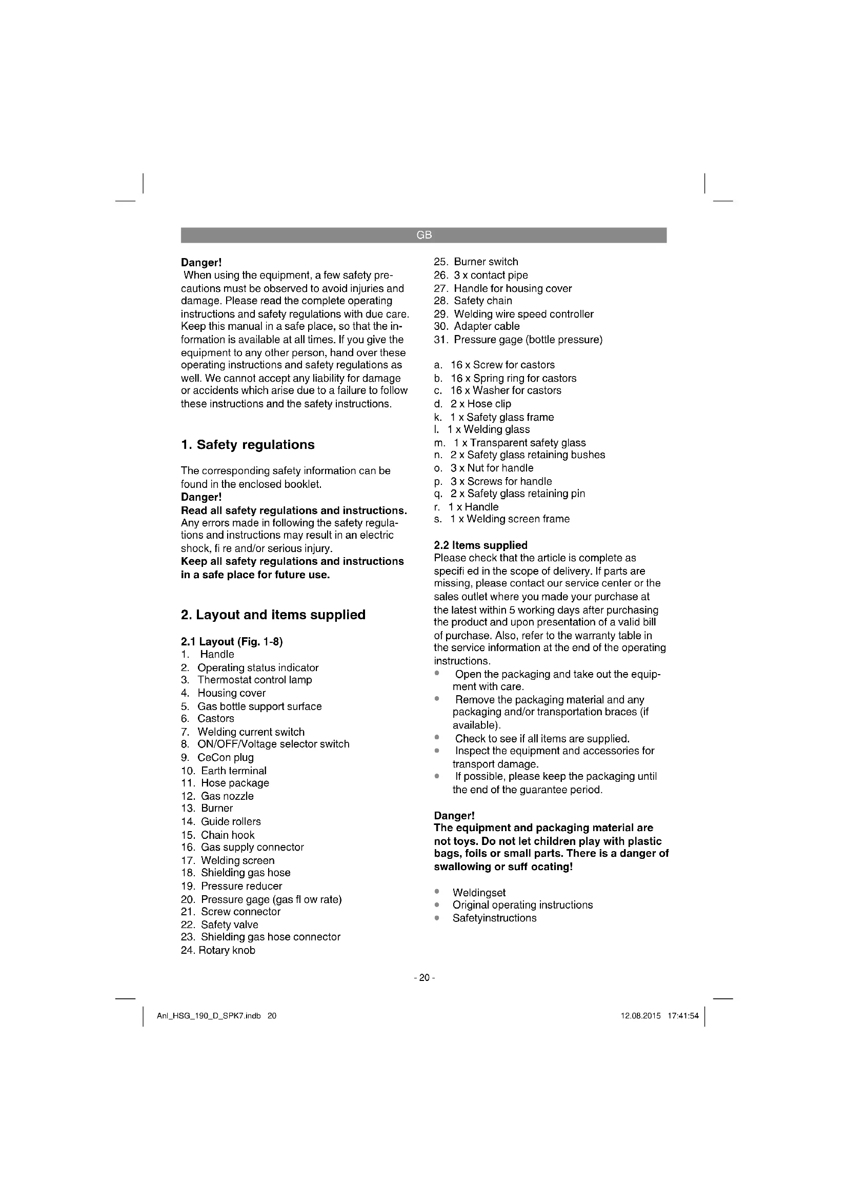 19-25) The gas bottle is not supplied. Fit the gas bottle cables as shown in Figures 19 - 21. Ensure that the safety chain (28) is secure and that the welding set cannot tip over. Anl_HSG_190_D_SPK7.indb 22Anl_HSG_190_D_SPK7.indb 22 12.08.2015 17:41:5412.08.2015 17:41:54GB