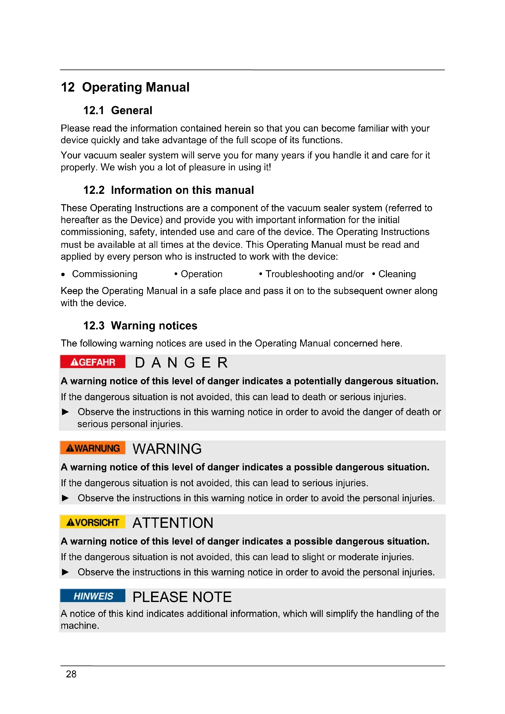 These Operating Instructions are a component of the vacuum sealer system (referred to hereafter as the Device) and provide you with important information for the initial commissioning, safety, intended use and care of the device. The Operating Instructions must be available at all times at the device. This Operating Manual must be read and applied by every person who is instructed to work with the device: Commissioning Operation Troubleshooting and/or Cleaning Keep the Operating Manual in a safe place and pass it on to the subsequent owner along with the device.
