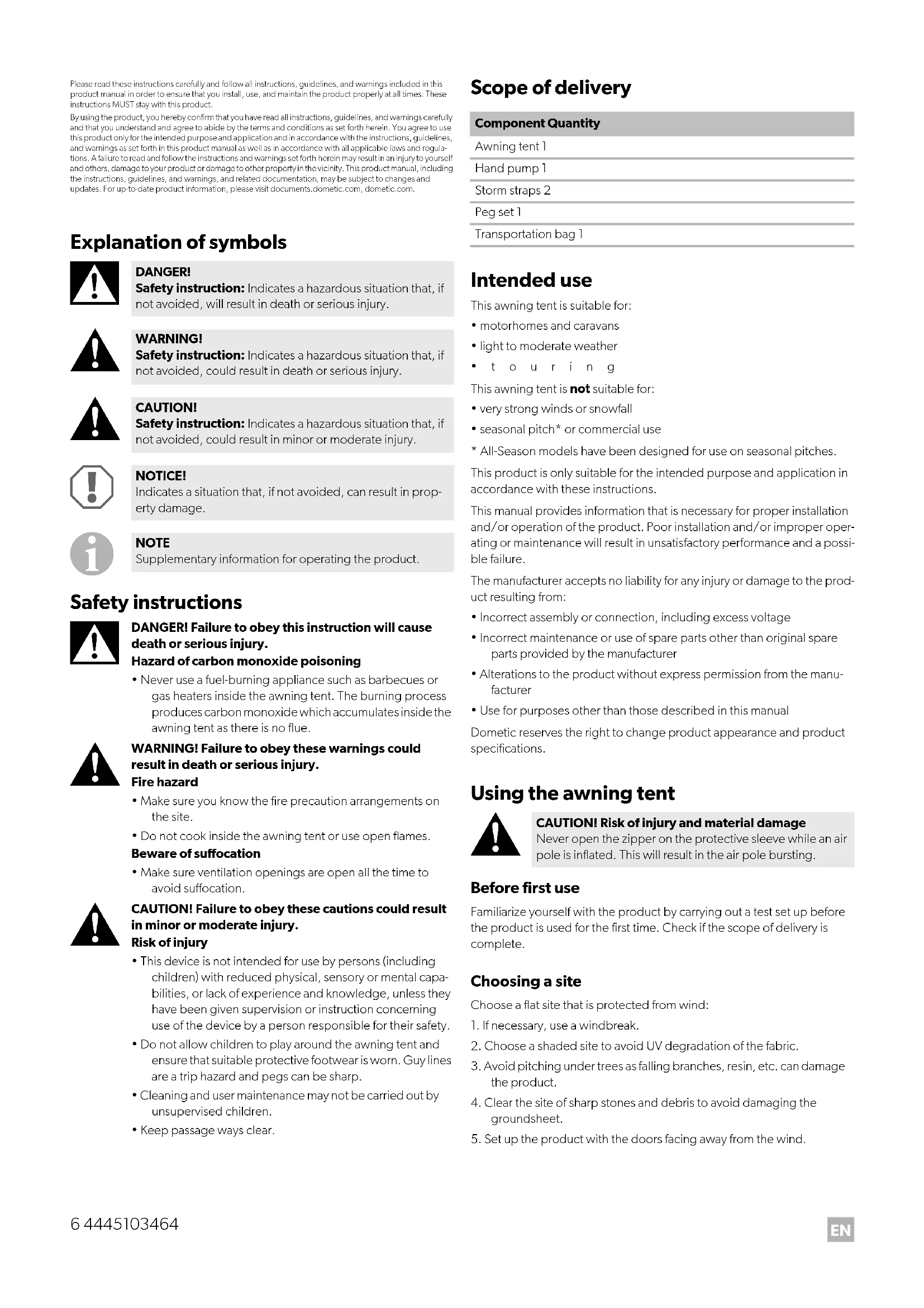 DANGER! Safety instruction: Indicates a hazardous situation that, if not avoided, will result in death or serious injury. WARNING! Safety instruction: Indicates a hazardous situation that, if not avoided, could result in death or serious injury. CAUTION! Safety instruction: Indicates a hazardous situation that, if not avoided, could result in minor or moderate injury. NOTICE! Indicates a situation that, if not avoided, can result in prop- erty damage. NOTE Supplementary information for operating the product. Component Quantity Awning tent 1 Hand pump 1 Storm straps 2 Peg set 1 Transportation bag 1 CAUTION! Risk of injury and material damage Never open the zipper on the protective sleeve while an air pole is inflated. This will result in the air pole bursting. DometicSunshineAirPro300-500_IOM_4445103464_EMEA16_xxxx-xx-xx.book Seite 6 Donnerstag, 30. September 2021 3:10 15EN