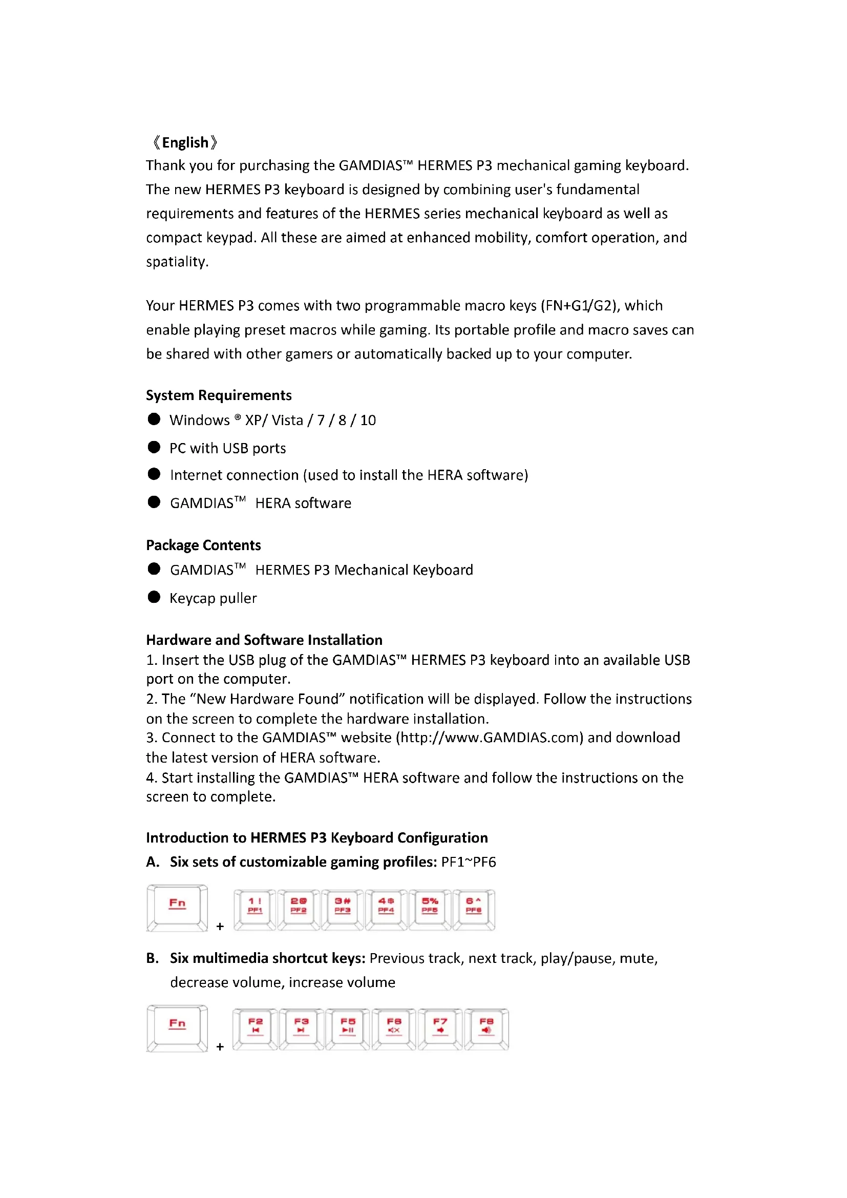 Thank you for purchasing the GAMDIAS™ HERMES P3 mechanical gaming keyboard. The new HERMES P3 keyboard is designed by combining user's fundamental requirements and features of the HERMES series mechanical keyboard as well as compact keypad. All these are aimed at enhanced mobility, comfort operation, and spatiality. Your HERMES P3 comes with two programmable macro keys (FN+G1/G2), which enable playing preset macros while gaming. Its portable profile and macro saves can be shared with other gamers or automatically backed up to your computer. System Requirements ● Windows ® XP/ Vista / 7 / 8 / 10 ● PC with USB ports ● Internet connection (used to install the HERA software) ● GAMDIAS™ HERA software Package Contents ● GAMDIAS™ HERMES P3 Mechanical Keyboard ● Keycap puller Hardware and Software Installation