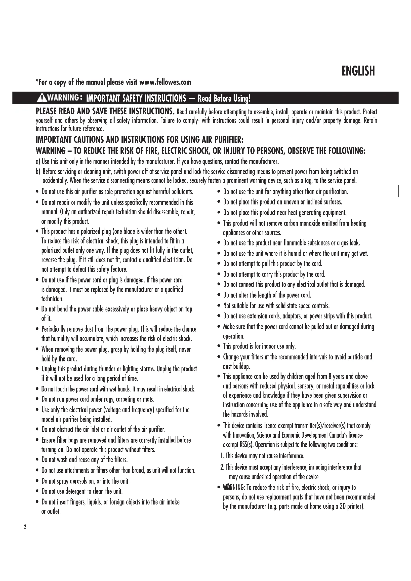 - WARNING: To reduce the risk of fire, electric shock, or injury to persons, do not use replacement parts that have not been recommended by the manufacturer (e.g. parts made at home using a 3D printer). IMPORTANT CAUTIONS AND INSTRUCTIONS FOR USING AIR PURIFIER: *For a copy of the manual please visit www.fellowes.com PLEASE READ AND SAVE THESE INSTRUCTIONS. Read carefully before attempting to assemble, install, operate or maintain this product. Protect yourself and others by observing all safety information. Failure to comply- with instructions could result in personal injury and/or property damage. Retain instructions for future reference. IMPORTANT SAFETY INSTRUCTIONS — Read Before Using! WARNING – TO REDUCE THE RISK OF FIRE, ELECTRIC SHOCK, OR INJURY TO PERSONS, OBSERVE THE FOLLOWING: a) Use this unit only in the manner intended by the manufacturer. If you have questions, contact the manufacturer. b) Before servicing or cleaning unit, switch power off at service panel and lock the service disconnecting means to prevent power from being switched on accidentally. When the service disconnecting means cannot be locked, securely fasten a prominent warning device, such as a tag, to the service panel.3 PACKAGING CONTENTS