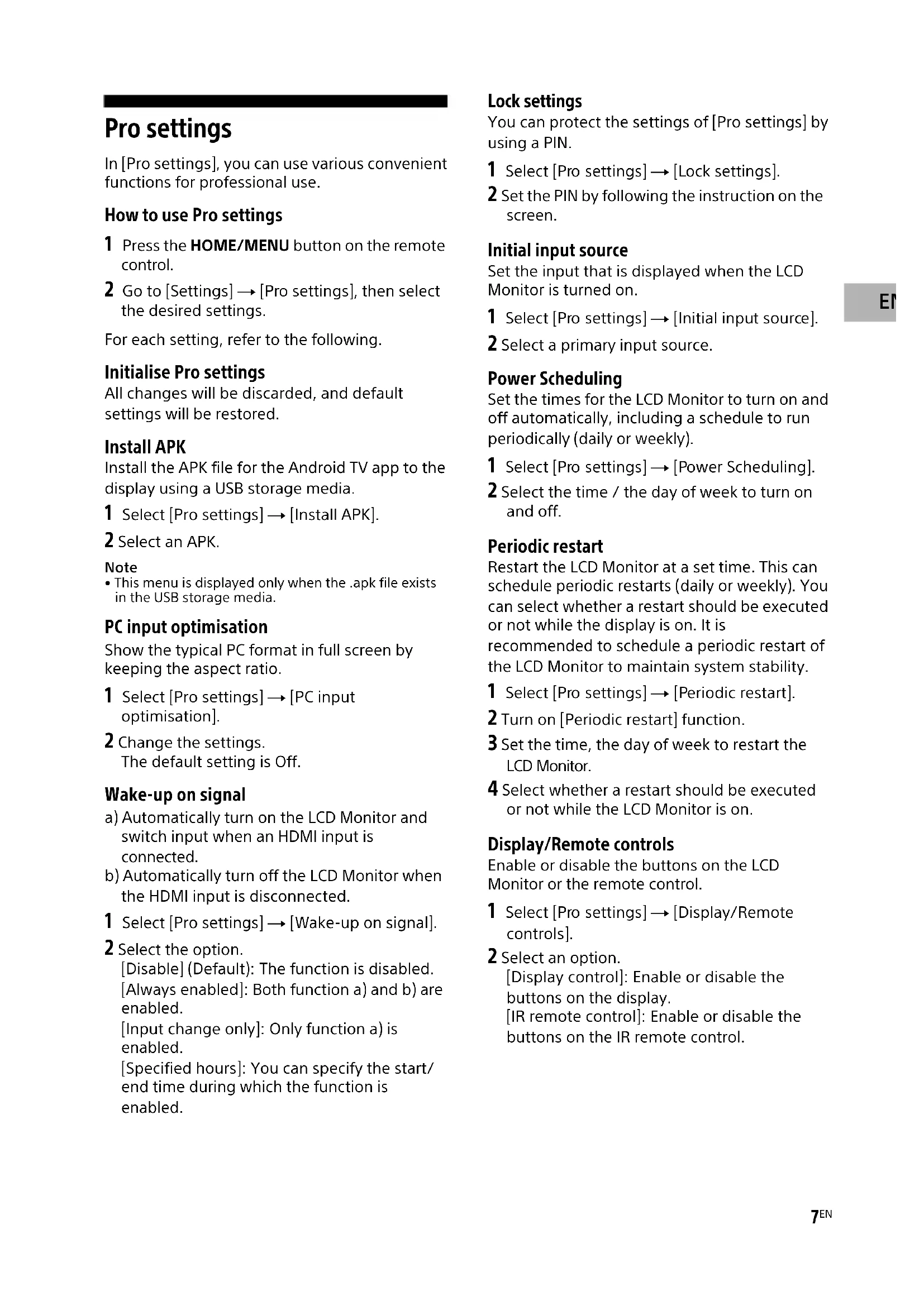 - This menu is displayed only when the .apk file exists in the USB storage media. PC input optimisation Show the typical PC format in full screen by keeping the aspect ratio. 1 Select [Pro settings] t [PC input optimisation]. 2 Change the settings. The default setting is Off. Wake-up on signal a) Automatically turn on the LCD Monitor and switch input when an HDMI input is connected. b) Automatically turn off the LCD Monitor when the HDMI input is disconnected. 1 Select [Pro settings] t [Wake-up on signal]. 2 Select the option. [Disable] (Default): The function is disabled. [Always enabled]: Both function a) and b) are enabled. [Input change only]: Only function a) is enabled. [Specified hours]: You can specify the start/ end time during which the function is enabled. Lock settings You can protect the settings of [Pro settings] by using a PIN. 1 Select [Pro settings] t [Lock settings]. 2 Set the PIN by following the instruction on the screen. Initial input source Set the input that is displayed when the LCD Monitor is turned on. 1 Select [Pro settings] t [Initial input source]. 2 Select a primary input source. Power Scheduling Set the times for the LCD Monitor to turn on and off automatically, including a schedule to run periodically (daily or weekly). 1 Select [Pro settings] t [Power Scheduling]. 2 Select the time / the day of week to turn on and off. Periodic restart Restart the LCD Monitor at a set time. This can schedule periodic restarts (daily or weekly). You can select whether a restart should be executed or not while the display is on. It is recommended to schedule a periodic restart of the LCD Monitor to maintain system stability. 1 Select [Pro settings] t [Periodic restart]. 2 Turn on [Periodic restart] function. 3 Set the time, the day of week to restart the LCD Monitor. 4 Select whether a restart should be executed or not while the LCD Monitor is on. Display/Remote controls Enable or disable the buttons on the LCD Monitor or the remote control. 1 Select [Pro settings] t [Display/Remote controls]. 2 Select an option. [Display control]: Enable or disable the buttons on the display. [IR remote control]: Enable or disable the buttons on the IR remote control. B2B EU.book Page 7 Monday, December 18, 2023 3:37 PME:\SONY TV\SY23_APRB_EU_RG_121\5054415121\5054415121_01EN.fm master page: Left FW-75EZ20L / 65EZ20L / 55EZ20L / 50EZ20L / 43EZ20L 5-054-415-12(1)