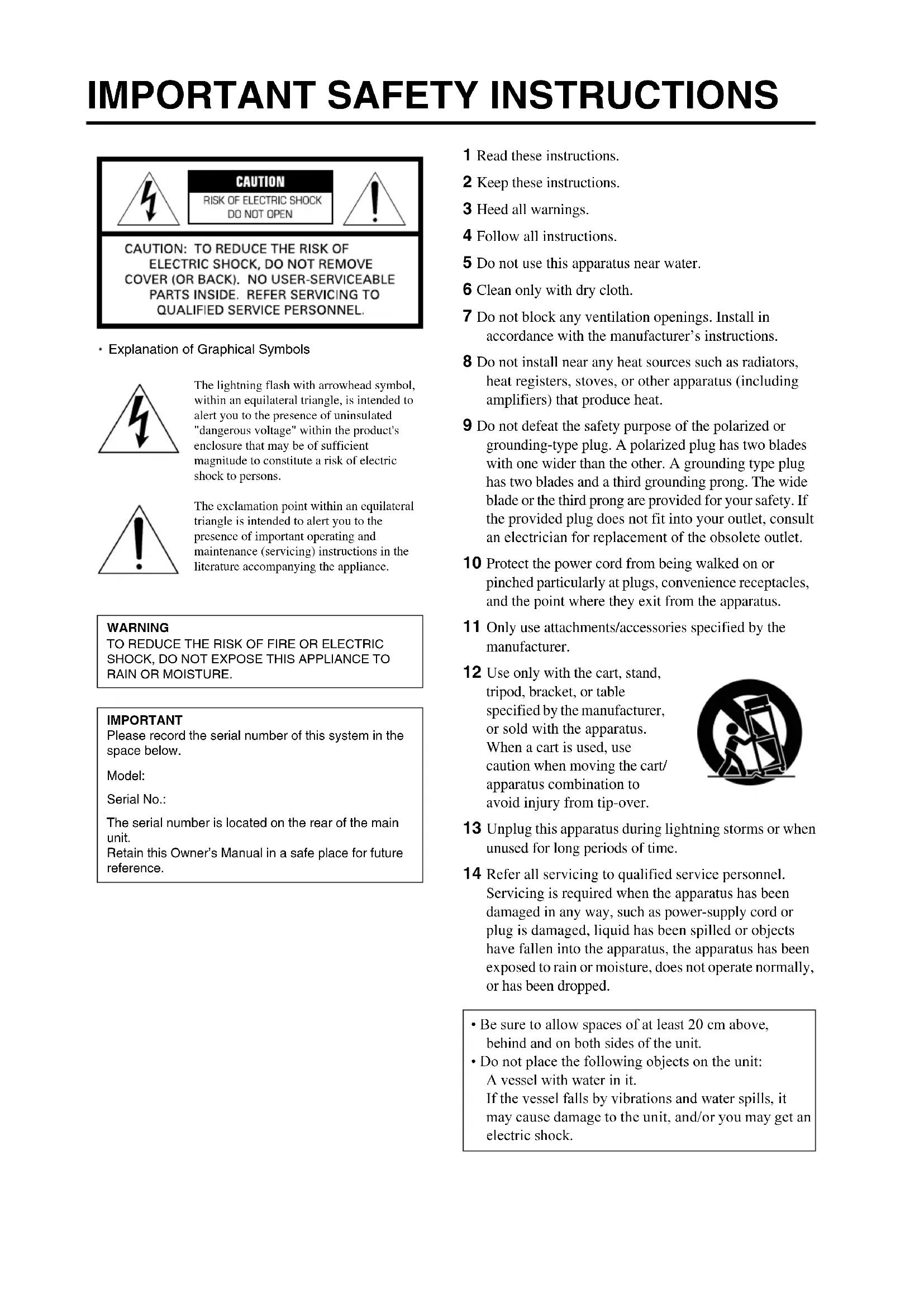Cover(CA).fm Page 1 Thursday, April 17, 2003 6:41 PMIMPORTANT SAFETY INSTRUCTIONS 1 Read these instructions. 2 Keep these instructions. 3 Heed all warnings. 4 Follow all instructions. 5 Do not use this apparatus near water. 6 Clean only with dry cloth. 7 Do not block any ventilation openings. Install in accordance with the manufacturer’s instructions. 8 Do not install near any heat sources such as radiators, heat registers, stoves, or other apparatus (including amplifiers) that produce heat. 9 Do not defeat the safety purpose of the polarized or grounding-type plug. A polarized plug has two blades with one wider than the other. A grounding type plug has two blades and a third grounding prong. The wide blade or the third prong are provided for your safety. If the provided plug does not fit into your outlet, consult an electrician for replacement of the obsolete outlet. 10 Protect the power cord from being walked on or pinched particularly at plugs, convenience receptacles, and the point where they exit from the apparatus. 11 Only use attachments/accessories specified by the manufacturer. 12 Use only with the cart, stand, tripod, bracket, or table specified by the manufacturer, or sold with the apparatus. When a cart is used, use caution when moving the cart/ apparatus combination to avoid injury from tip-over. 13 Unplug this apparatus during lightning storms or when unused for long periods of time. 14 Refer all servicing to qualified service personnel. Servicing is required when the apparatus has been damaged in any way, such as power-supply cord or plug is damaged, liquid has been spilled or objects have fallen into the apparatus, the apparatus has been exposed to rain or moisture, does not operate normally, or has been dropped. IMPORTANT Please record the serial number of this system in the space below. Model: Serial No.: The serial number is located on the rear of the main unit. Retain this Owner’s Manual in a safe place for future reference.