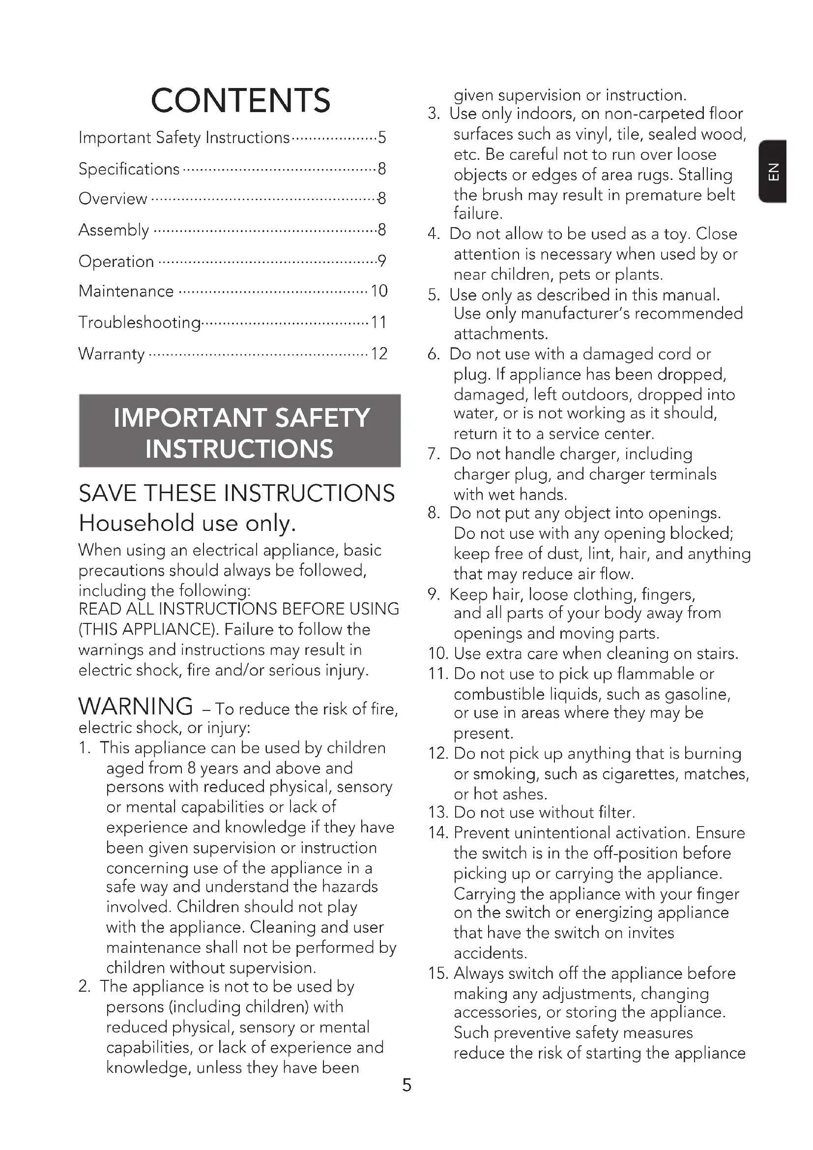 Household use only. When using an electrical appliance, basic precautions should always be followed, including the following:READ ALL INSTRUCTIONS BEFORE USING (THIS APPLIANCE). Failure to follow the warnings and instructions may result in electric shock, re and/or serious injury. WARNING – To reduce the risk of re, electric shock, or injury:1. This appliance can be used by children aged from 8 years and above and persons with reduced physical, sensory or mental capabilities or lack of experience and knowledge if they have been given supervision or instruction concerning use of the appliance in a safe way and understand the hazards involved. Children should not play with the appliance. Cleaning and user maintenance shall not be performed by children without supervision.2. The appliance is not to be used by persons (including children) with reduced physical, sensory or mental capabilities, or lack of experience and knowledge, unless they have been given supervision or instruction.3. Use only indoors, on non-carpeted oor surfaces such as vinyl, tile, sealed wood, etc. Be careful not to run over loose objects or edges of area rugs. Stalling the brush may result in premature belt failure.4. Do not allow to be used as a toy. Close attention is necessary when used by or near children, pets or plants.5. Use only as described in this manual. Use only manufacturer’s recommended attachments.6. Do not use with a damaged cord or plug. If appliance has been dropped, damaged, left outdoors, dropped into water, or is not working as it should, return it to a service center.7. Do not handle charger, including charger plug, and charger terminals with wet hands.8. Do not put any object into openings. Do not use with any opening blocked; keep free of dust, lint, hair, and anything that may reduce air ow.9. Keep hair, loose clothing, ngers, and all parts of your body away from openings and moving parts.10. Use extra care when cleaning on stairs.11. Do not use to pick up ammable or combustible liquids, such as gasoline, or use in areas where they may be present.12. Do not pick up anything that is burning or smoking, such as cigarettes, matches, or hot ashes.13. Do not use without lter.14. Prevent unintentional activation. Ensure the switch is in the off-position before picking up or carrying the appliance. Carrying the appliance with your nger on the switch or energizing appliance that have the switch on invites accidents.15. Always switch off the appliance before making any adjustments, changing accessories, or storing the appliance. Such preventive safety measures reduce the risk of starting the appliance CONTENTS Important Safety Instructions .................... Specications ............................................. Overview ..................................................... Assembly .................................................... Operation ................................................... Maintenance ............................................ Troubleshooting ....................................... Warranty ...................................................