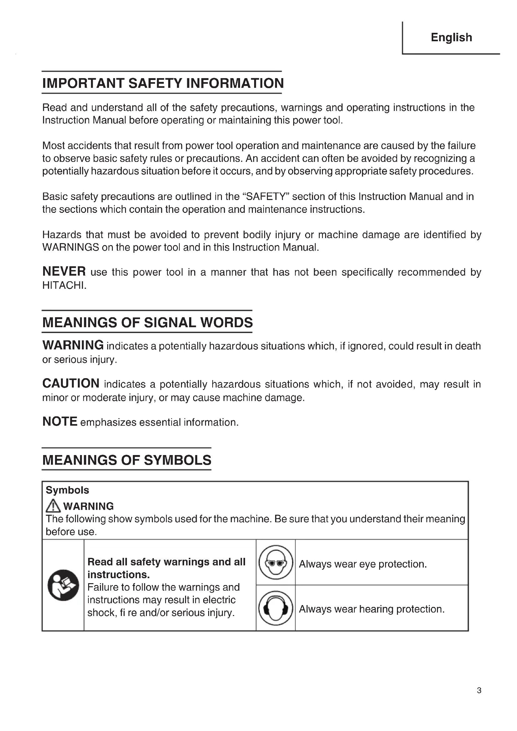 Read and understand all of the safety precautions, warnings and operating instructions in the Instruction Manual before operating or maintaining this power tool. Most accidents that result from power tool operation and maintenance are caused by the failure to observe basic safety rules or precautions. An accident can often be avoided by recognizing a potentially hazardous situation before it occurs, and by observing appropriate safety procedures. Basic safety precautions are outlined in the “SAFETY” section of this Instruction Manual and in the sections which contain the operation and maintenance instructions. Hazards that must be avoided to prevent bodily injury or machine damage are identifi ed by WARNINGS on the power tool and in this Instruction Manual. NEVER use this power tool in a manner that has not been specifi cally recommended by HITACHI.