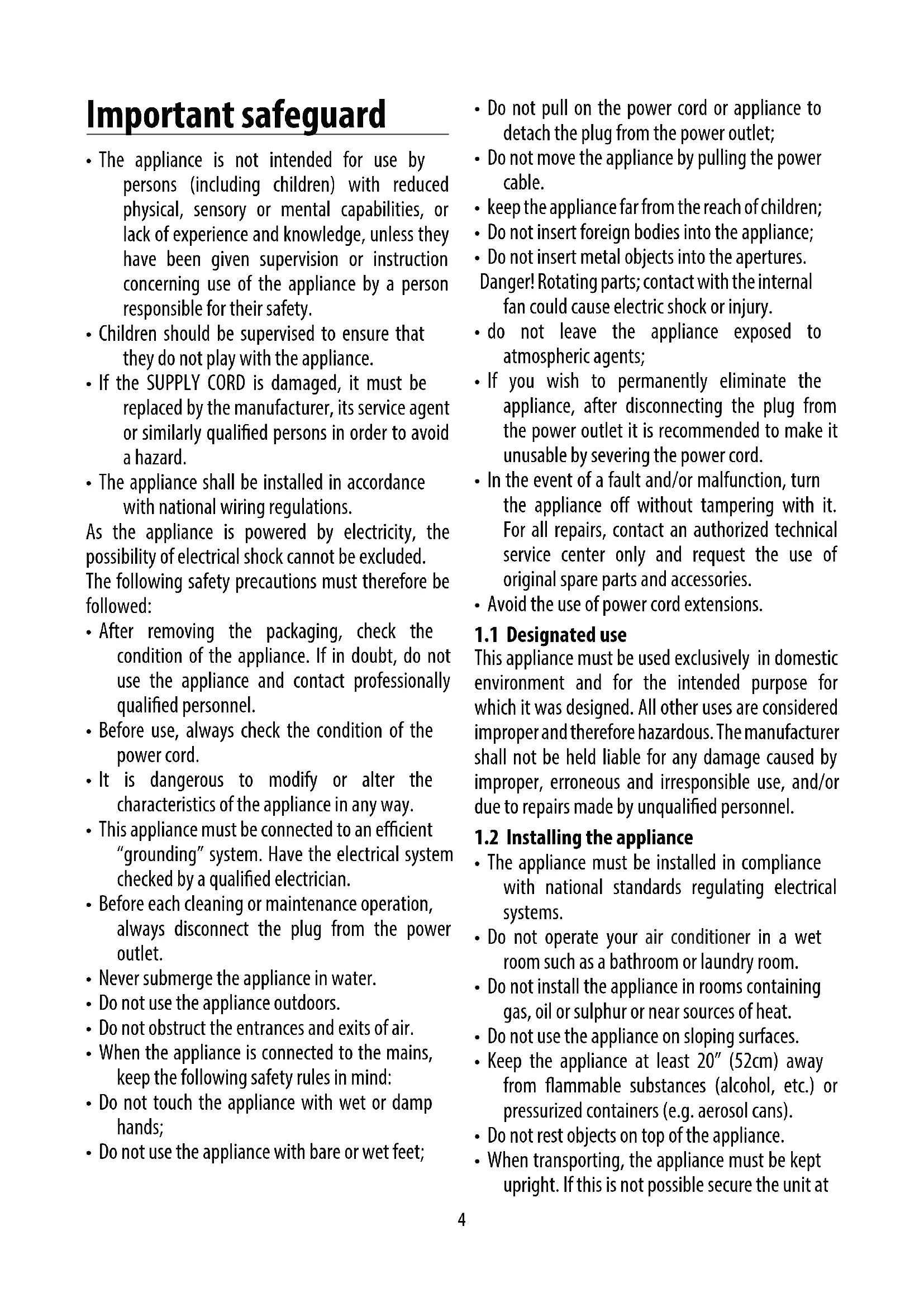 Clean the lter and dry thoroughly before putting back. Unit should be stored in large, well ventilated area. TECHNICAL SPECIFICATIONS Power supply voltage see rating label Max. absorbed power during air conditioning “ Refrigerant “ Cooling capacity “16 LIMIT CONDITIONS Room temperature for air conditioning 64 - 95°F (18° - 35°C) Room temperature for heating (on some models only) 50 - 77°F (10 - 25°C) Maximum relative humidity : 80% RH Transport, lling, cleaning, recovery and disposal of refrigerant should be performed by a technical service centre appointed by the manufacturer only. The appliance should be disposed of by a specialized center appointed by your municipality. TO AVOID DAMAGE TO THE UNIT: NEVER TRANSPORT OR TURN THE APPLIANCE UPSIDE DOWN OR ON ITS SIDE. IF THIS OCCURS, WAIT 6 HOURS BEFORE TURNING THE APPLIANCE ON, 24 HOURS IS RECOMMENDED. After the unit has been on its side, oil needs to return to the compressor to en- sure proper function. Without allowing the unit this time (6-24 hours) the unit may function for only a short time, and then the compressor will break down from lack of oil. ELECTRICAL CONNECTION This appliance is equipped with a 3 prong grounded plug. The plug must be connected into an outlet that is properly installed and grounded in the accordance with all local codes and ordi- nances. Do not modify the plug provided with the appliance. If it will not t the outlet, have a proper outlet installed by a qualied elec- trician or relocate the unit to a proper outlet. If the household electrical supply does not meet the above specications, or if you are not sure your home has an eective electrical ground, have a qualied electrician or your local electrical utility company check it and correct any problems. SAFETY PLUG The appliance is tted with a safety plug to protect the power cable. If power is cut o, unplug from the outlet and make sure the power cable is undamaged. If the cable is damaged, call the service center immediately. If power cuts o frequently and the power cable is undamaged, contact a qualied electrician.