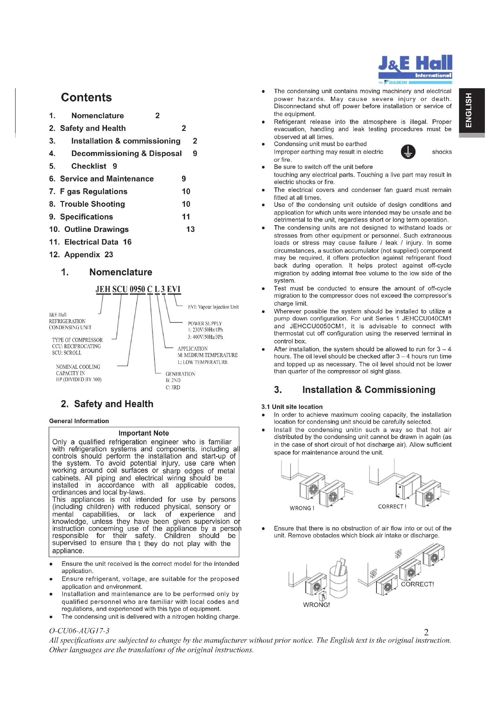 EVI: Vapour Injection UnitPOWER SUPPLY1: 230V/50Hz/1Ph3: 400V/50Hz/3PhAPPLICATIONM: MEDIUM TEMPERATUREL: LOW TEMPERATUREGENERATIONB: 2NDC: 3RDNOMINAL COOLINGCAPACITY INHP (DIVIDED BY 100)TYPE OF COMPRESSORCCU: RECIPROCATINGSCU: SCROLLJ&E HallREFRIGERATIONCONDENSING UNIT ● The condensing unit contains moving machinery and electrical power hazards. May cause severe injury or death. Disconnectand shut off power before installation or service of the equipment. ● Refrigerant release into the atmosphere is illegal. Proper evacuation, handling and leak testing procedures must be observed at all times.● Condensing unit must be earthed Improper earthing may result in electric shocks or fire.● Be sure to switch off the unit before touching any electrical parts. Touching a live part may result in electric shocks or fire.● The electrical covers and condenser fan guard must remain fitted at all times.● Use of the condensing unit outside of design conditions and application for which units were intended may be unsafe and be detrimental to the unit, regardless short or long term operation.● The condensing units are not designed to withstand loads or stresses from other equipment or personnel. Such extraneous loads or stress may cause failure / leak / injury. In some circumstances, a suction accumulator (not supplied) component may be required, it offers protection against refrigerant flood back during operation. It helps protect against off-cycle migration by adding internal free volume to the low side of the system.● Test must be conducted to ensure the amount of off-cycle migration to the compressor does not exceed the compressor’s charge limit. ● Wherever possible the system should be installed to utilize a pump down configuration. For unit Series 1 JEHCCU040CM1 and JEHCCU0050CM1, it is advisable to connect with thermostat cut off configuration using the reserved terminal in control box. ● After installation, the system should be allowed to run for 3 – 4 hours. The oil level should be checked after 3 – 4 hours run time and topped up as necessary. The oil level should not be lower than quarter of the compressor oil sight glass. 3.1 Unit site location ● In order to achieve maximum cooling capacity, the installation location for condensing unit should be carefully selected. ● Install the condensing unitin such a way so that hot air distributed by the condensing unit cannot be drawn in again (as in the case of short circuit of hot discharge air). Allow sufficient space for maintenance around the unit. ● Ensure that there is no obstruction of air flow into or out of the unit. Remove obstacles which block air intake or discharge.CORRECT !WRONG !WRONG! CORRECT!