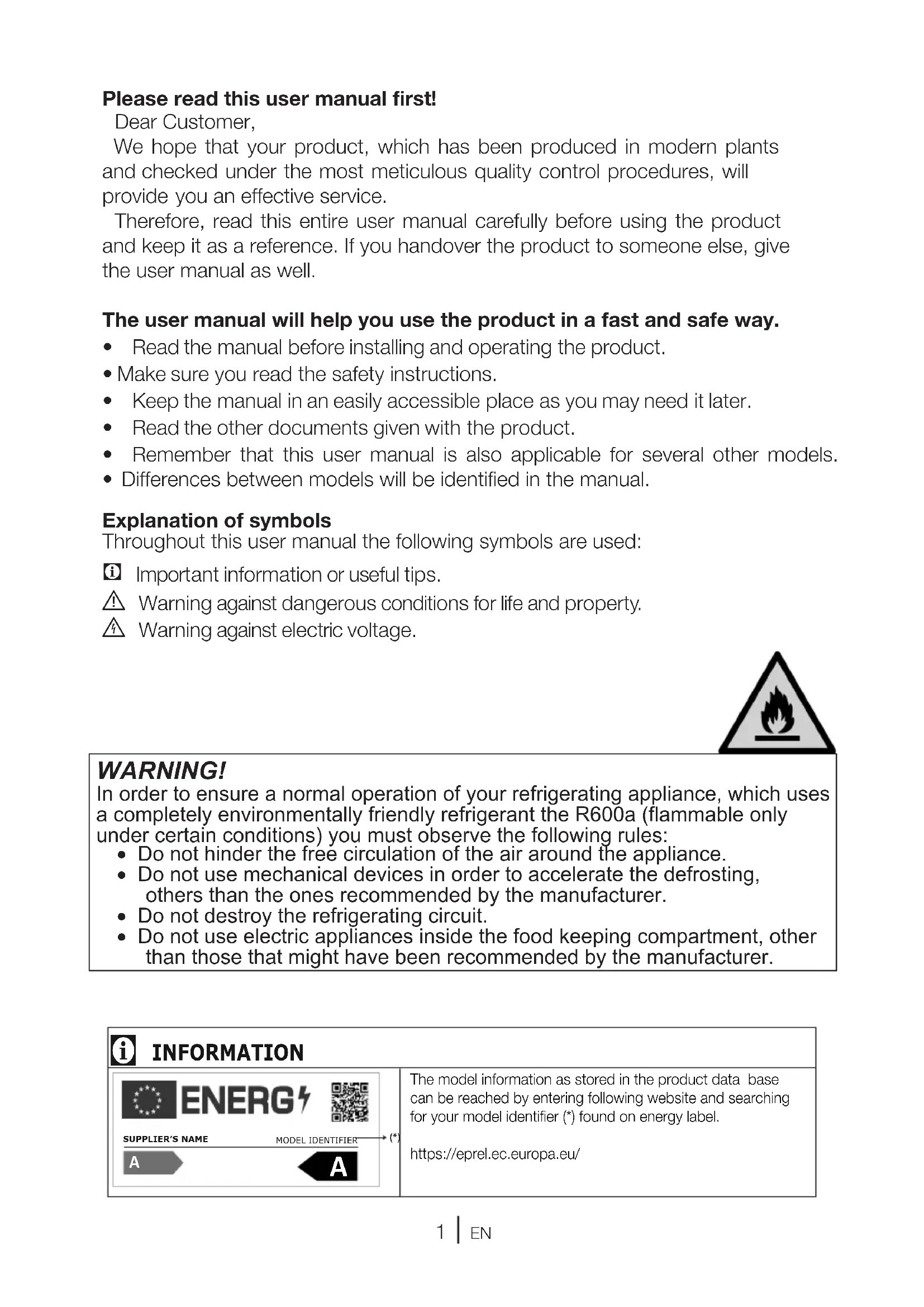 - Differences between models will be identified in the manual. Explanation of symbols Throughout this user manual the following symbols are used: C Import ant information or useful tips. A Warning against dangerous conditions for life and property. B Warning against electric voltage. WARNING! In order to ensure a normal operation of your refrigerating appliance, which uses a completely environmentally friendly refrigerant the R600a (flammable only under certain conditions) you must observe the following rules: