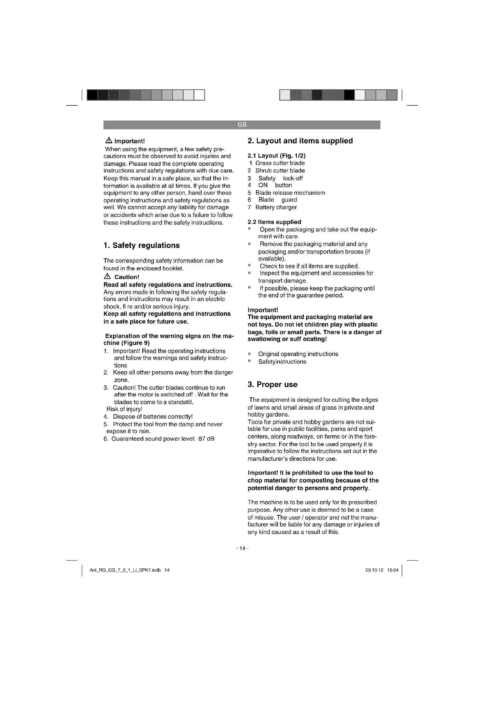 The equipment is designed for cutting the edges of lawns and small areas of grass in private and hobby gardens. Tools for private and hobby gardens are not sui- table for use in public facilities, parks and sport centers, along roadways, on farms or in the fore- stry sector. For the tool to be used properly it is imperative to follow the instructions set out in the manufacturer’s directions for use. Important! It is prohibited to use the tool to chop material for composting because of the potential danger to persons and property. The machine is to be used only for its prescribed purpose. Any other use is deemed to be a case of misuse. The user / operator and not the manu- facturer will be liable for any damage or injuries of any kind caused as a result of this. Anl_RG_CG_7_2_1_Li_SPK7.indb 14Anl_RG_CG_7_2_1_Li_SPK7.indb 14 29.10.12 16:0429.10.12 16:04GB
