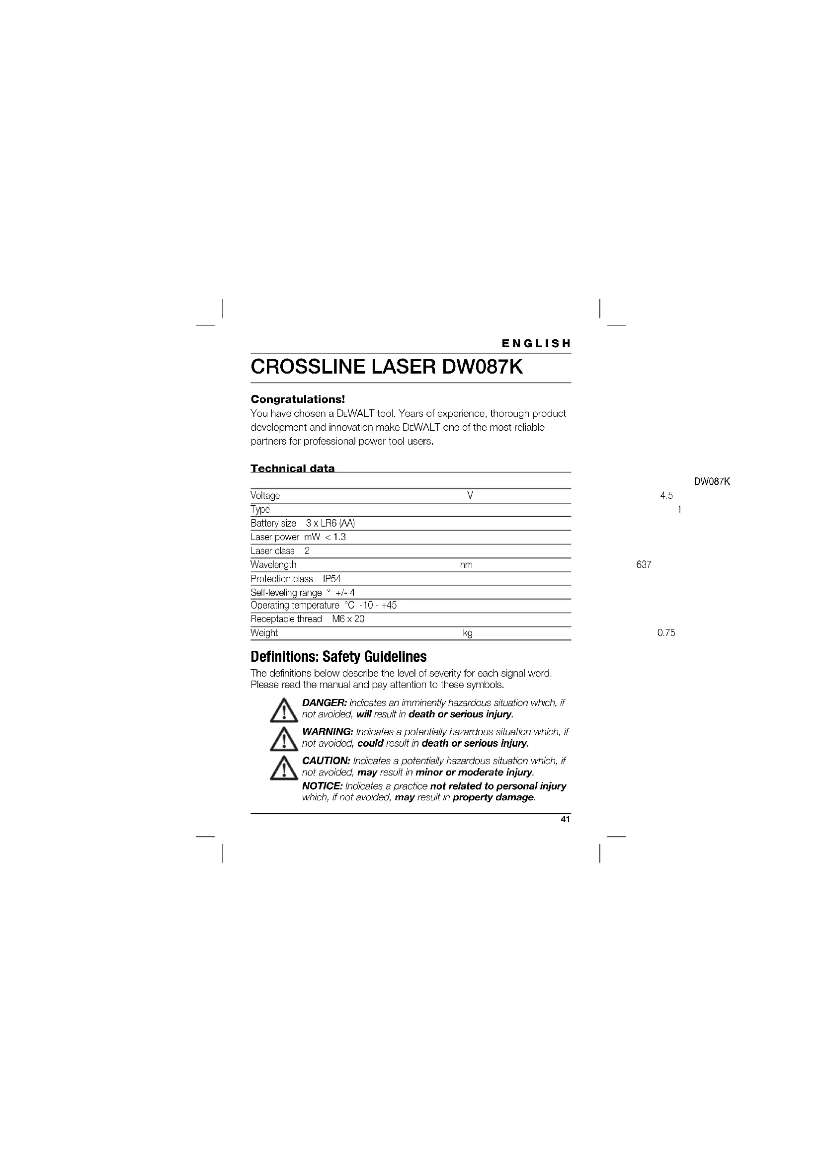 Congratulations! You have chosen a DEWALT tool. Years of experience, thorough product development and innovation make DEWALT one of the most reliable partners for professional power tool users. Technical data DW087K Voltage V 4.5 Type 1 Battery size 3 x LR6 (AA) Laser power mW < 1.3 Laser class 2 Wavelength nm 637 Protection class IP54 Self-leveling range ° +/- 4 Operating temperature °C -10 - +45 Receptacle thread M6 x 20 Weight kg 0.75 Defi nitions: Safety Guidelines The definitions below describe the level of severity for each signal word. Please read the manual and pay attention to these symbols.