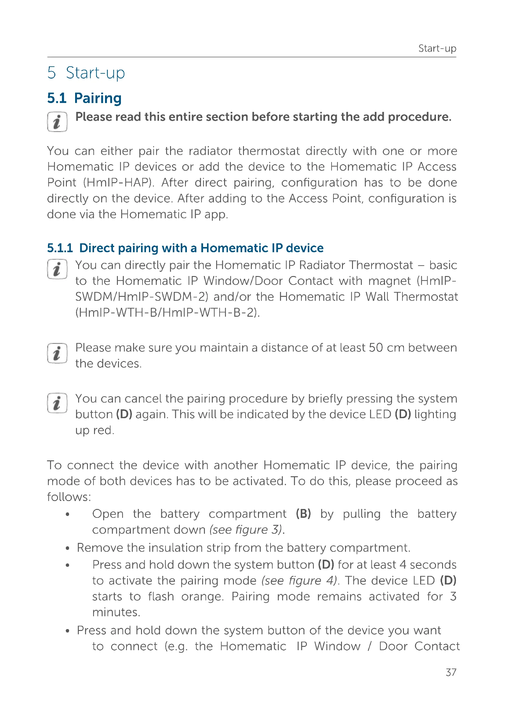 You can directly pair the Homematic IP Radiator Thermostat – basic to the Homematic IP Window/Door Contact with magnet (HmIP- SWDM/HmIP-SWDM-2) and/or the Homematic IP Wall Thermostat (HmIP-WTH-B/HmIP-WTH-B-2). Please make sure you maintain a distance of at least 50cm between the devices. You can cancel the pairing procedure by briefly pressing the system button (D) again. This will be indicated by the device LED (D) lighting up red. To connect the device with another Homematic IP device, the pairing mode of both devices has to be activated. To do this, please proceed as follows:
