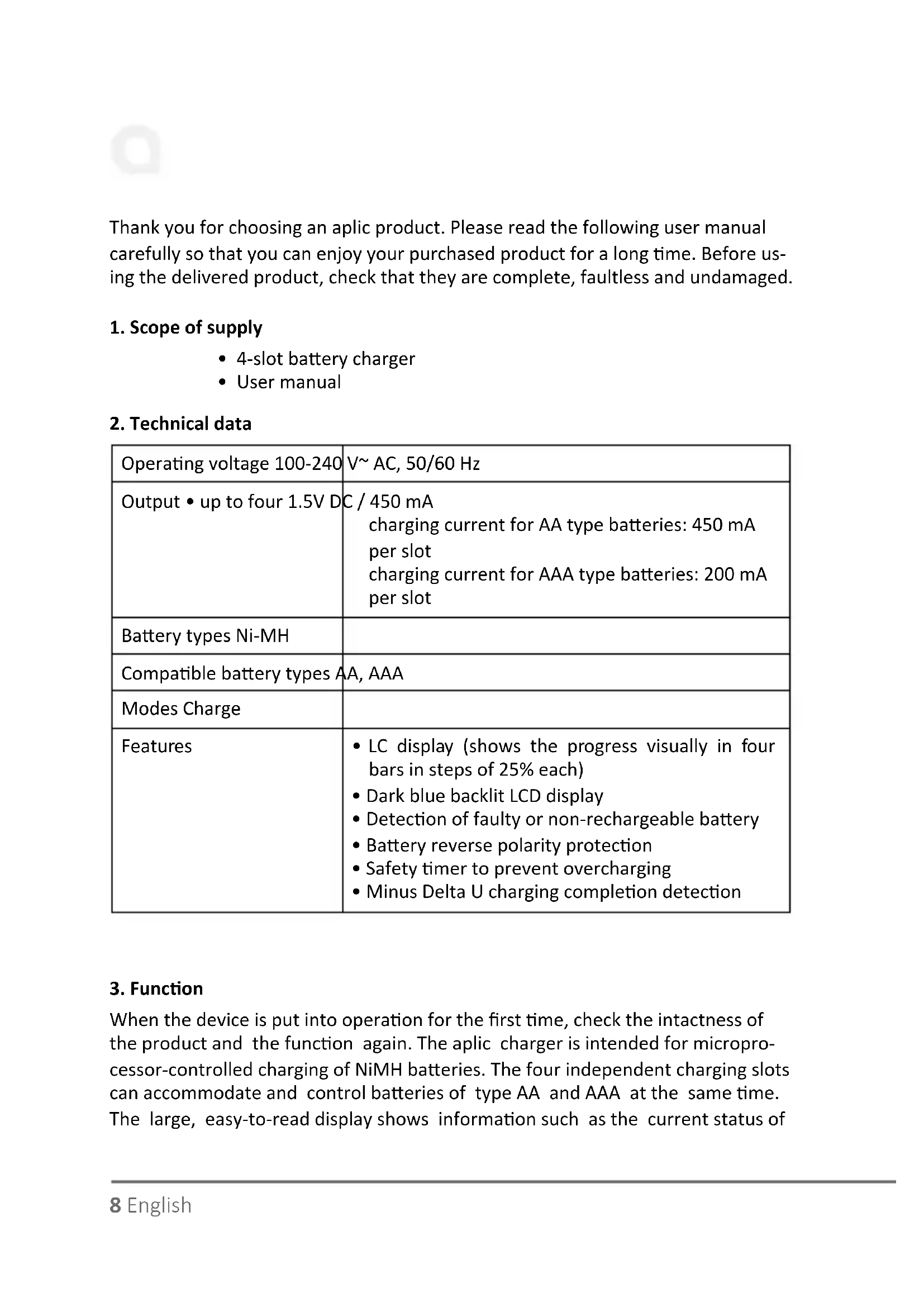 When the device is put into operaon for the rst me, check the intactness of the product and the funcon again. The aplic charger is intended for micropro- cessor-controlled charging of NiMH baeries. The four independent charging slots can accommodate and control baeries of type AA and AAA at the same me. The large, easy-to-read display shows informaon such as the current status of Operang voltage 100-240 V~ AC, 50/60 Hz Output • up to four 1.5V DC / 450 mA charging current for AA type baeries: 450 mA per slot charging current for AAA type baeries: 200 mA per slot Baery types Ni-MH Compable baery types AA, AAA Modes Charge Features • LC display (shows the progress visually in four bars in steps of 25% each)
