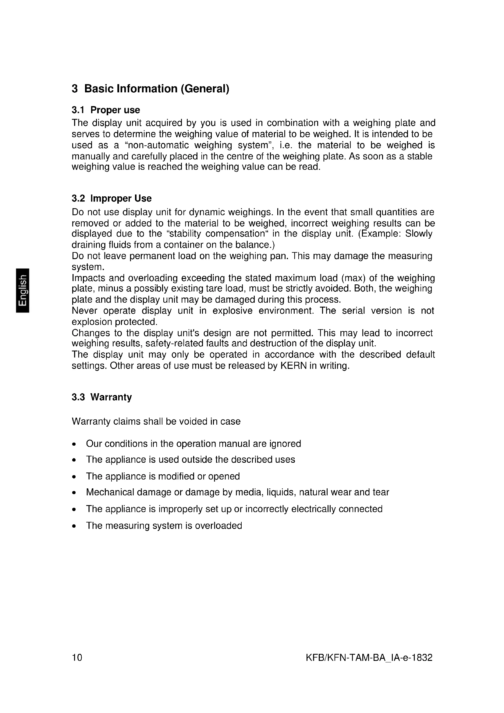 In the framework of quality assurance the measuring-related properties of the display unit and, if applicable, the testing weight, must be checked regularly. The responsible user must define a suitable interval as well as type and scope of this test. Information is available on KERN’s home page (www.kern-sohn.com with regard to the monitoring of display units’ test substances and the test weights required for this. In KERN’s accredited DKD calibration laboratory test weights and display units may be calibrated (return to the national standard) fast and at moderate cost. 4 Basic Safety Precautions