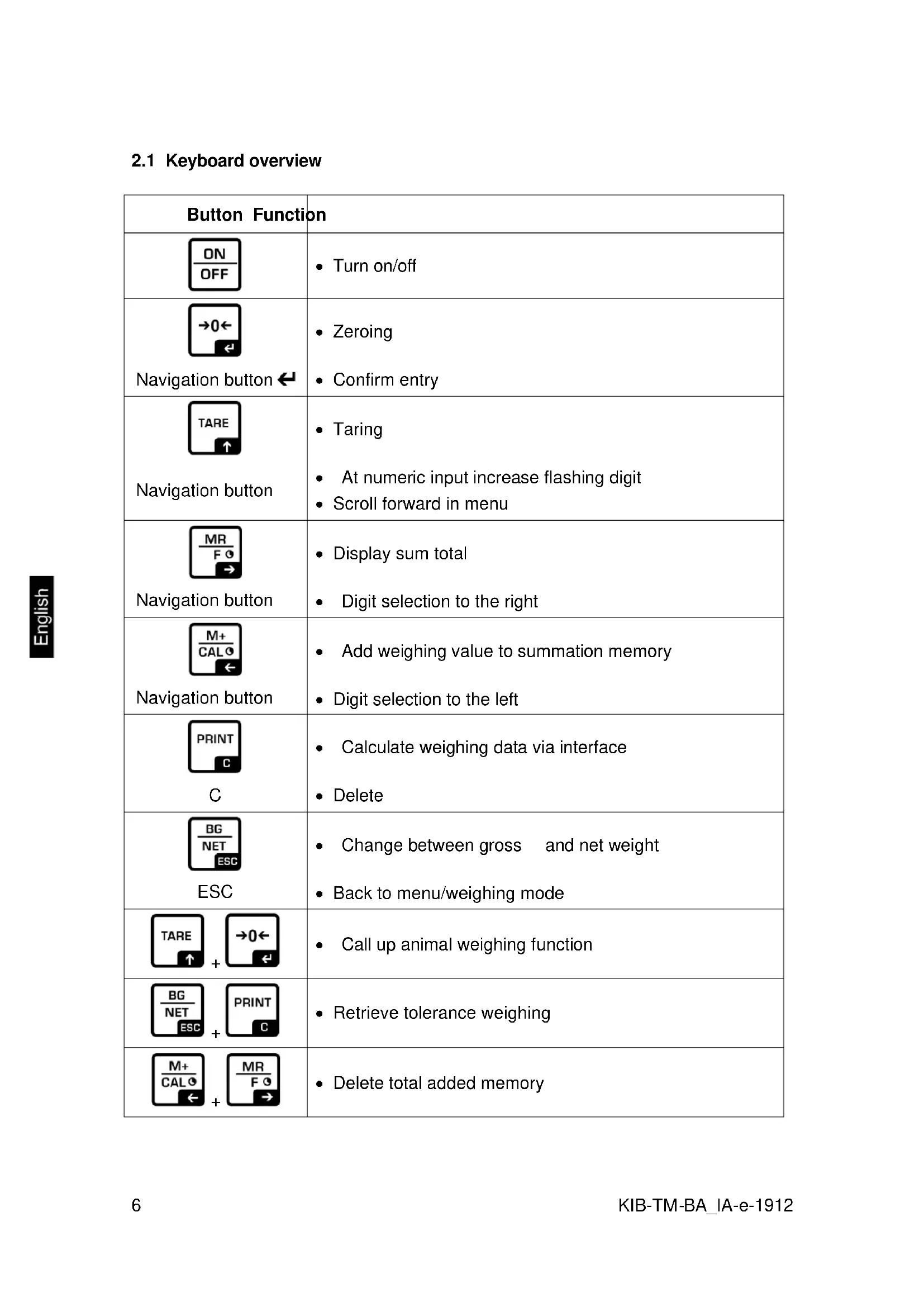 GS Gross weight NT Net weight TW Tare weight NO Number weighing processes Total Total of all individual weighingsKIB-TM-BA_IA-e-1912 41 9 Servicing, maintenance, disposal