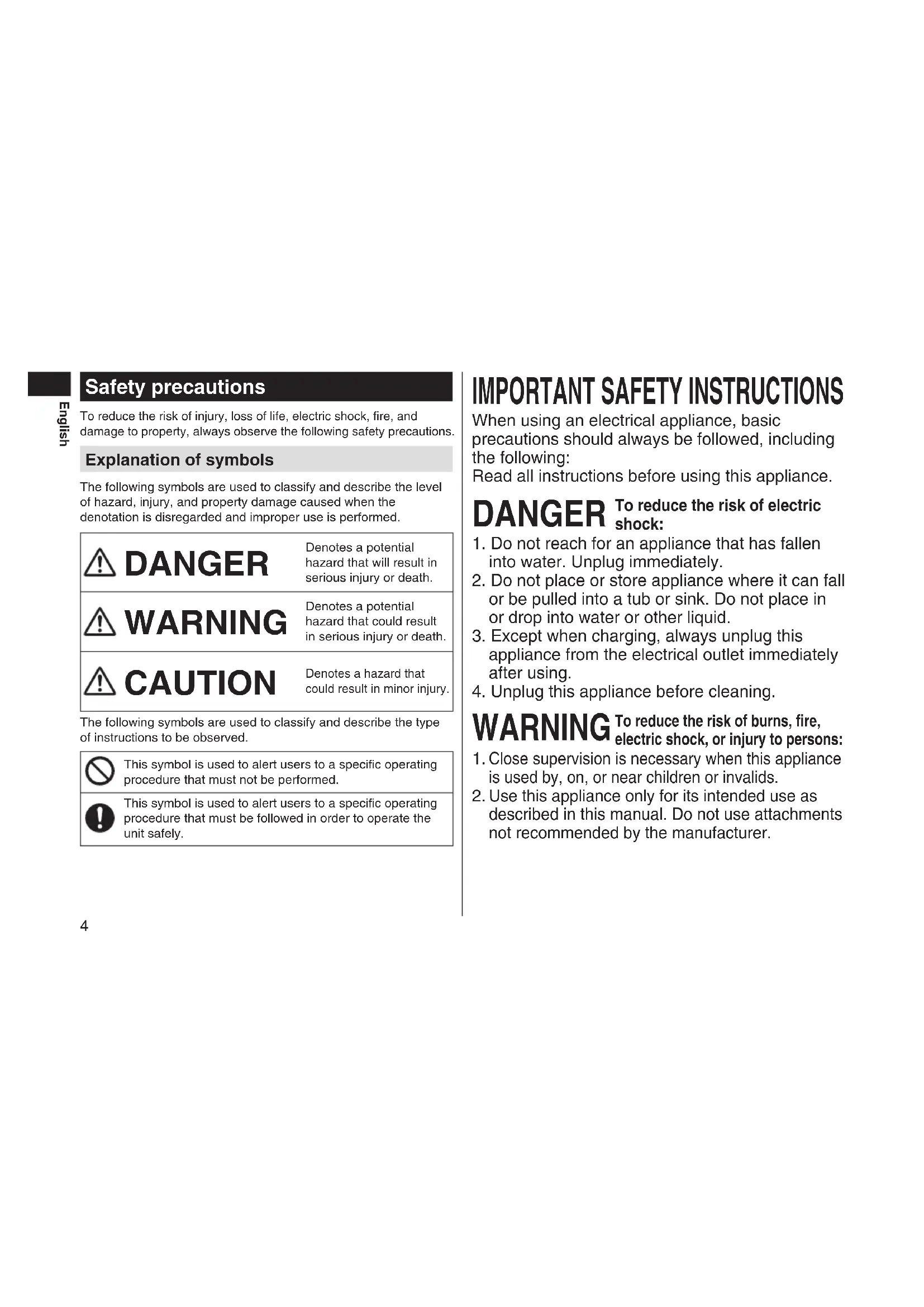 Using it with other products may cause discoloration or cracking. Check the system outer foil for cracks or deformations before use. -Failure to do so may cause injury to the skin. Be sure to place the protective cap on the shaver when carrying around or storing. -Failure to do so may cause injury to skin or reduce the life of the system outer foil. Disconnect the adaptor or the appliance plug by holding onto the adaptor or the appliance plug instead of the cord. -Failure to do so may cause electric shock or injury. Use caution when opening detergent as spout is sharp. -Failure to do so may cause injury.8 English If the battery fluid leaks out, take the following procedures. Do not touch the battery with your bare hands. -The battery fluid may cause blindness if it comes in contact with your eyes. Do not rub your eyes. Wash immediately with clean water and consult a physician.