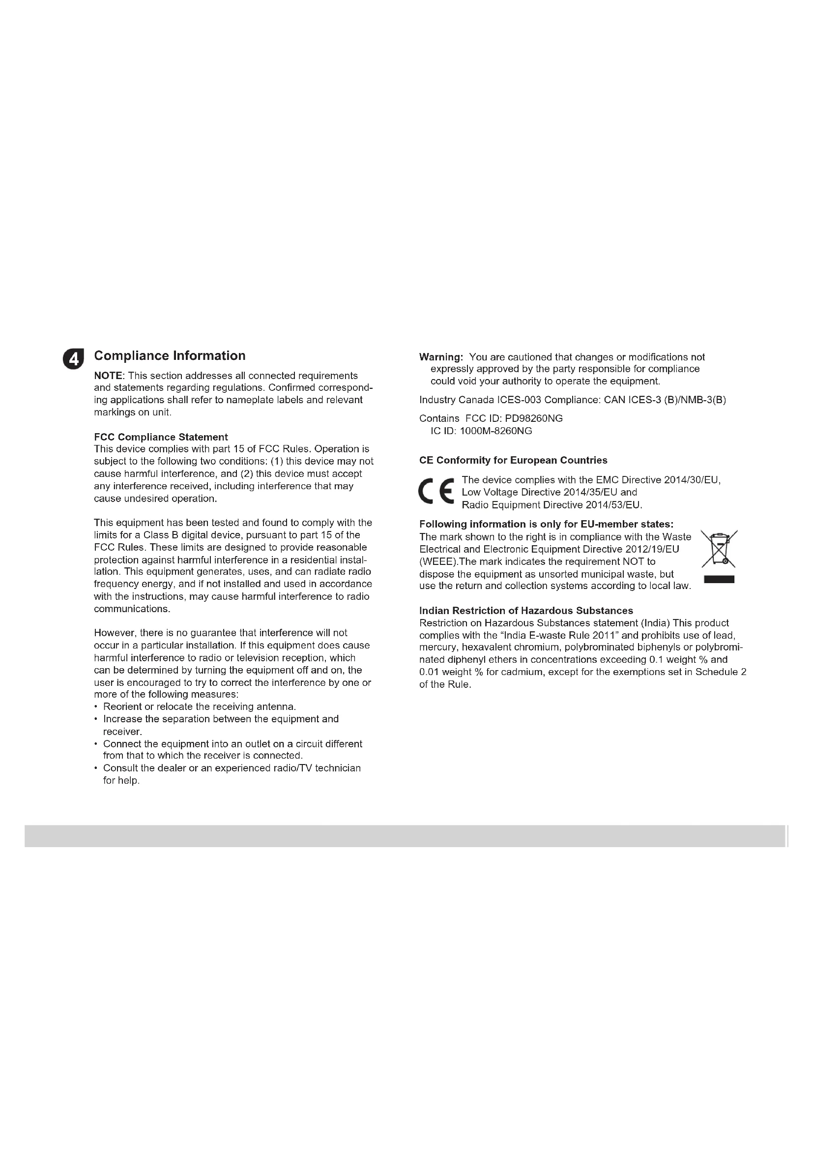 IFP6560 / IFP7560 / IFP6530 / IFP7530Warning: You are cautioned that changes or modifications not expressly approved by the party responsible for compliance could void your authority to operate the equipment. Industry Canada ICES-003 Compliance: CAN ICES-3 (B)/NMB-3(B) Contains FCC ID: PD98260NG IC ID: 1000M-8260NG Following information is only for EU-member states: The mark shown to the right is in compliance with the Waste Electrical and Electronic Equipment Directive 2012/19/EU (WEEE).The mark indicates the requirement NOT to dispose the equipment as unsorted municipal waste, but use the return and collection systems according to local law. Indian Restriction of Hazardous Substances Restriction on Hazardous Substances statement (India) This product complies with the “India E-waste Rule 2011” and prohibits use of lead, mercury, hexavalent chromium, polybrominated biphenyls or polybromi- nated diphenyl ethers in concentrations exceeding 0.1 weight % and