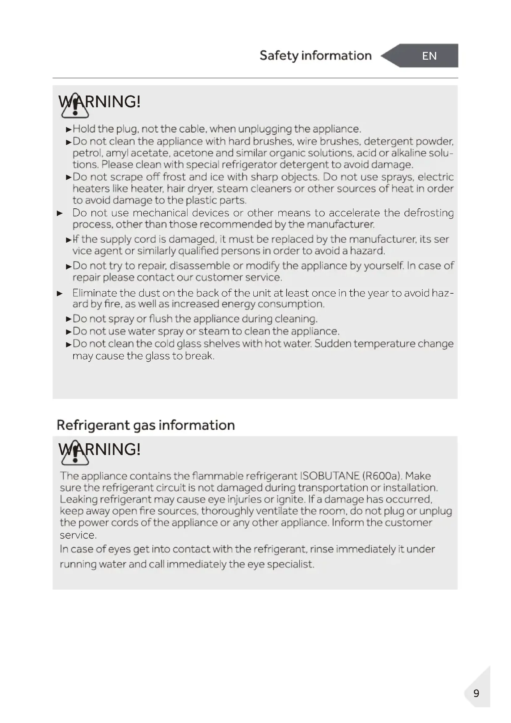 may cause the glass to break. WARNING! service. 9EN