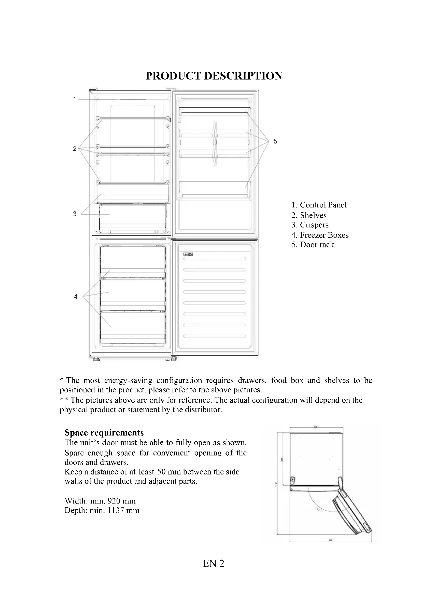 - The most energy-saving configuration requires drawers, food box and shelves to be positioned in the product, please refer to the above pictures. ** The pictures above are only for reference. The actual configuration will depend on the physical product or statement by the distributor. Space requirements The unit’s door must be able to fully open as shown. Spare enough space for convenient opening of the doors and drawers. Keep a distance of at least 50 mm between the side walls of the product and adjacent parts. Width: min. 920 mm Depth: min. 1137 mm