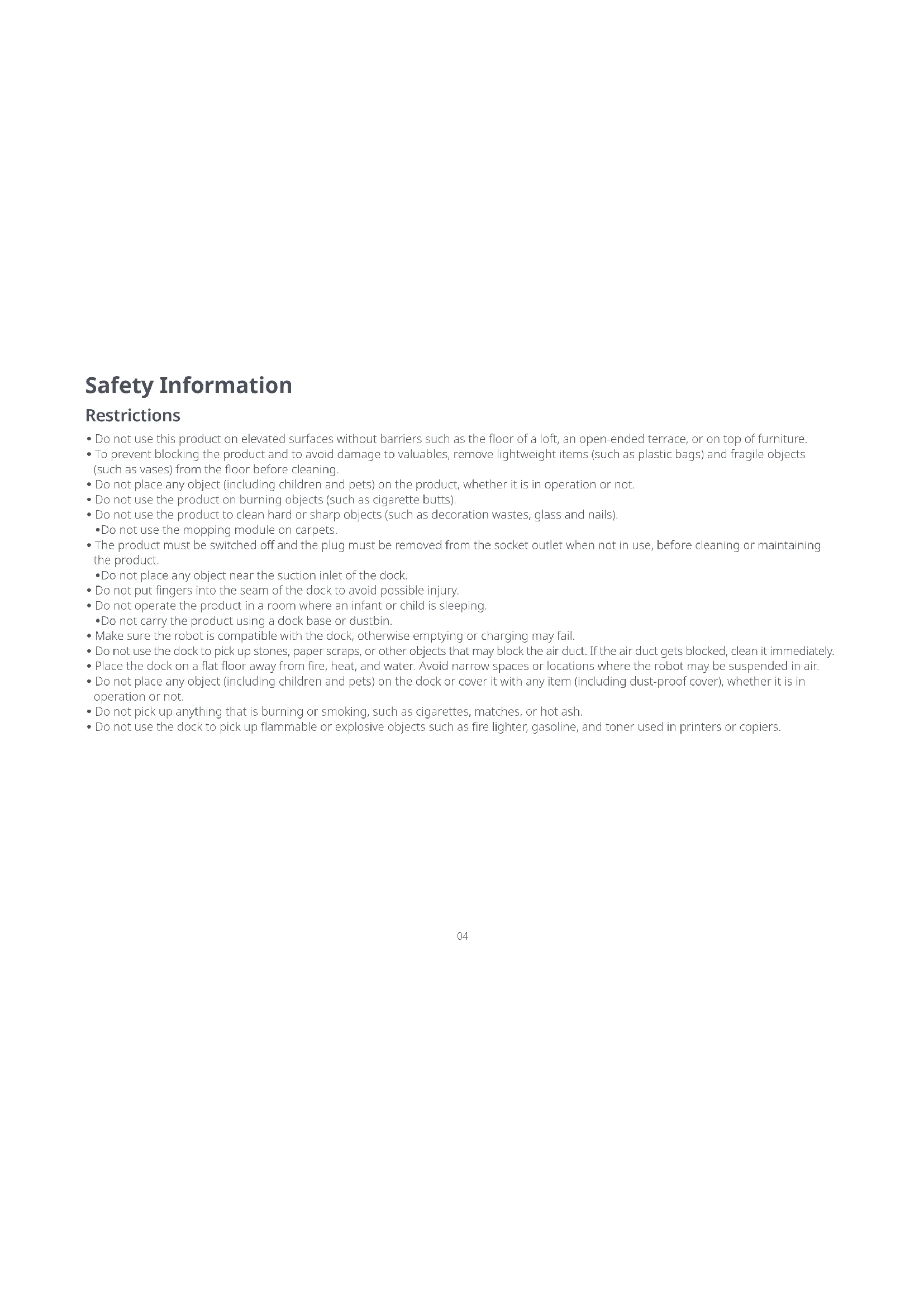 - Do not use the dock to pick up flammable or explosive objects such as fire lighter, gasoline, and toner used in printers or copiers. Safety Information05 Safety Information