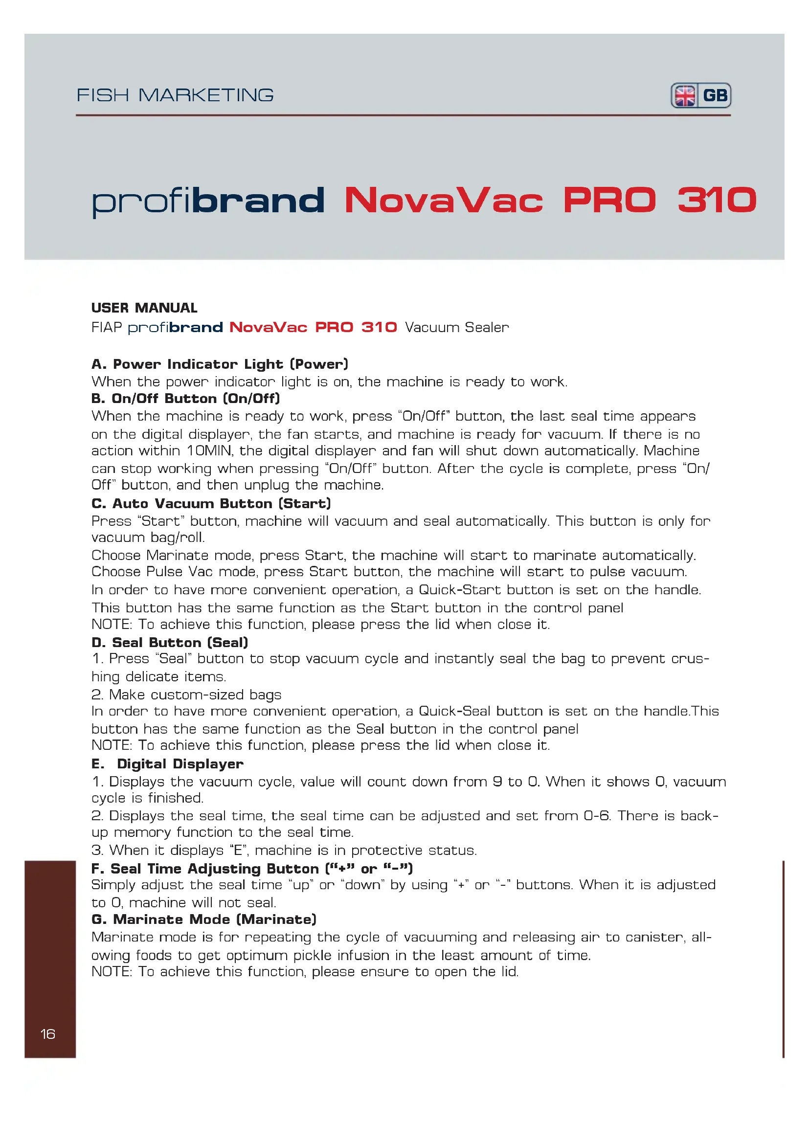 digital displayer will show and count down the sealing time to 0. And after this process, the lid will open automatically and beep. ** Press On/Off button to stop the machine’s all working processes. FISH MARKETING GB21 profibrand NovaVac PRO 310 FISH MARKETING