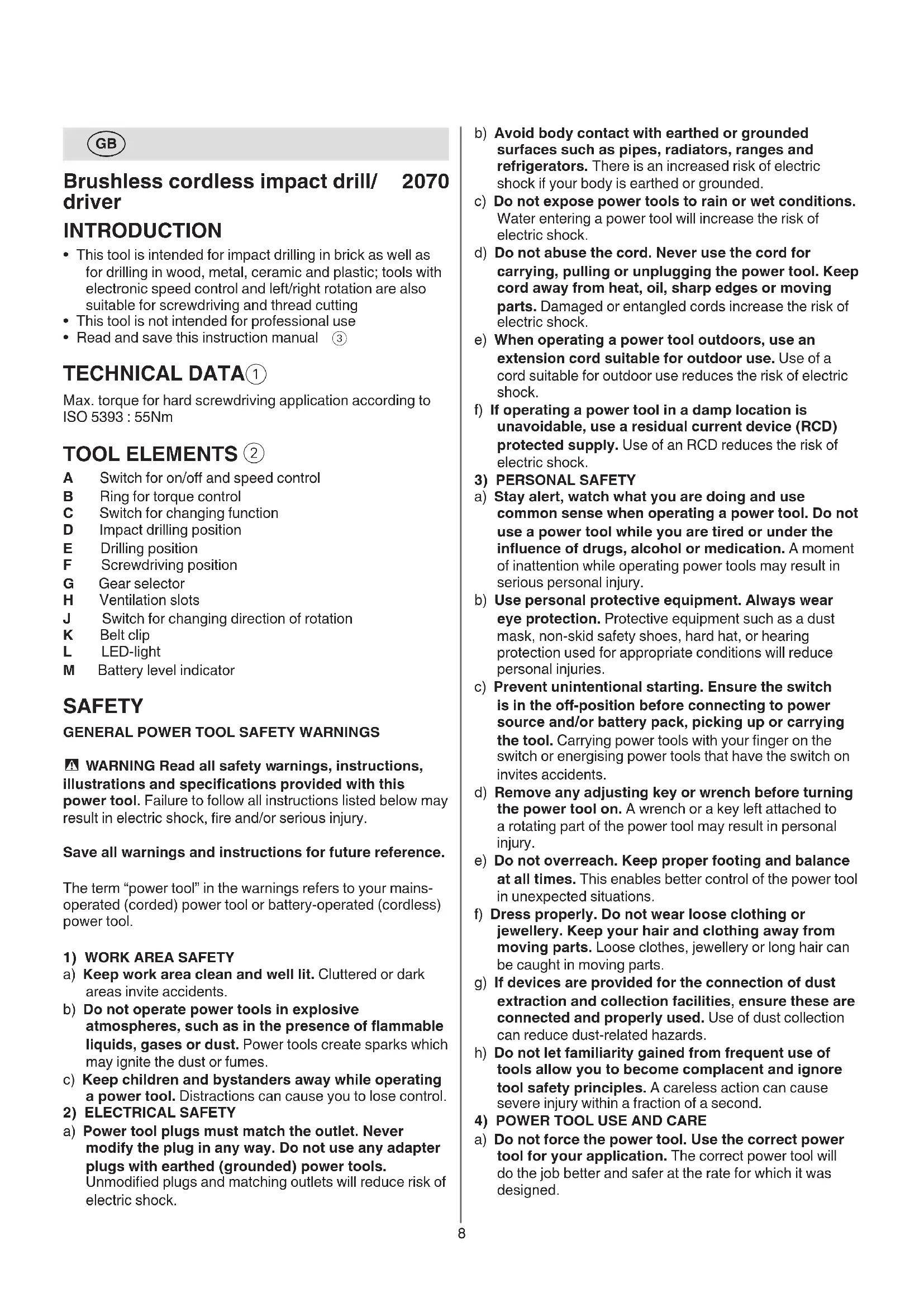 A Switch for on/o and speed control B Ring for torque control C Switch for changing function D Impact drilling position E Drilling position F Screwdriving position G Gear selector H Ventilation slots J Switch for changing direction of rotation K Belt clip L LED-light M Battery level indicator SAFETY