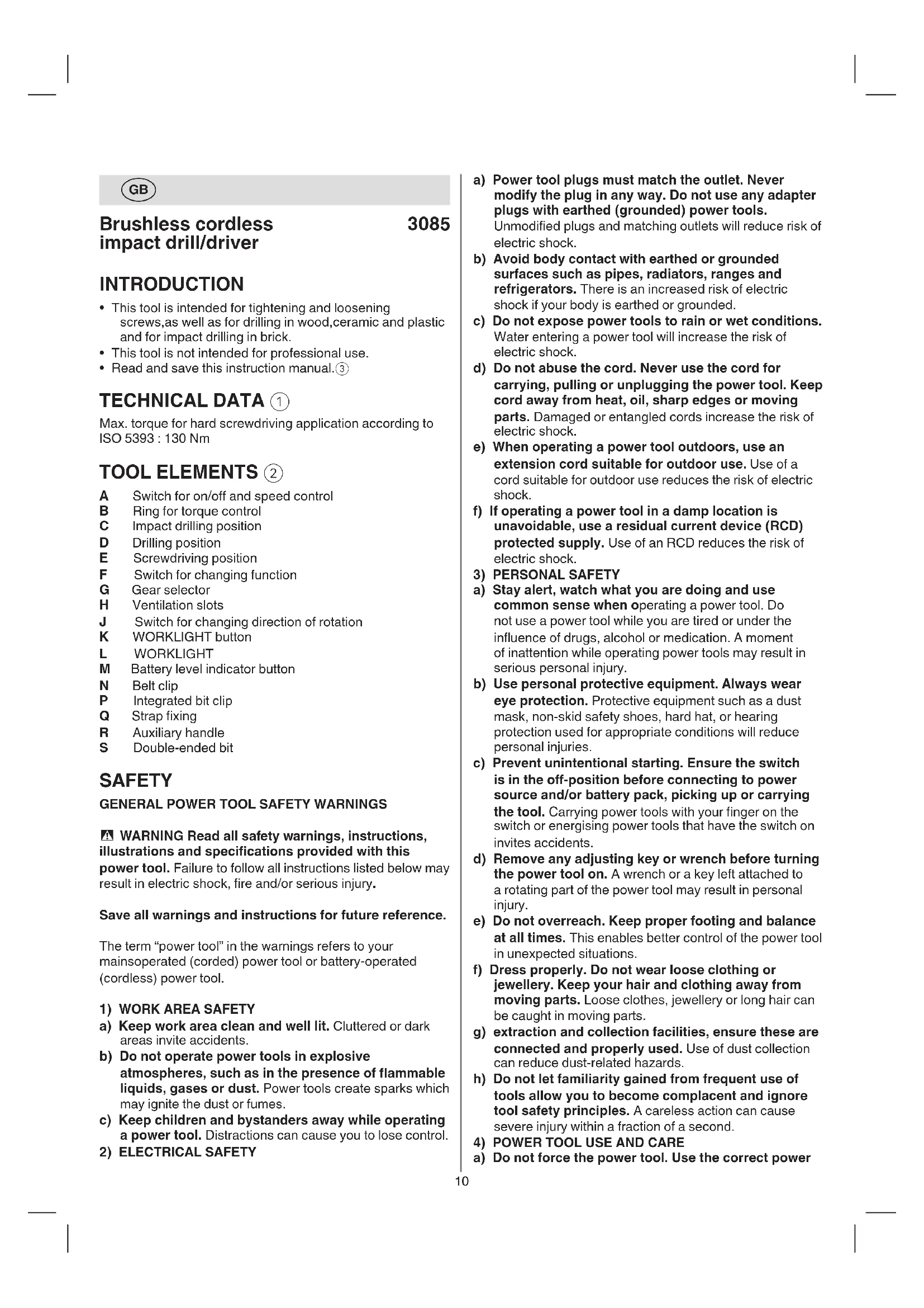 - Read and save this instruction manual.3 TECHNICAL DATA 1 Max. torque for hard screwdriving application according to ISO 5393 : 130 Nm TOOL ELEMENTS 2 A Switch for on/o and speed control B Ring for torque control C Impact drilling position D Drilling position E Screwdriving position F Switch for changing function G Gear selector H Ventilation slots