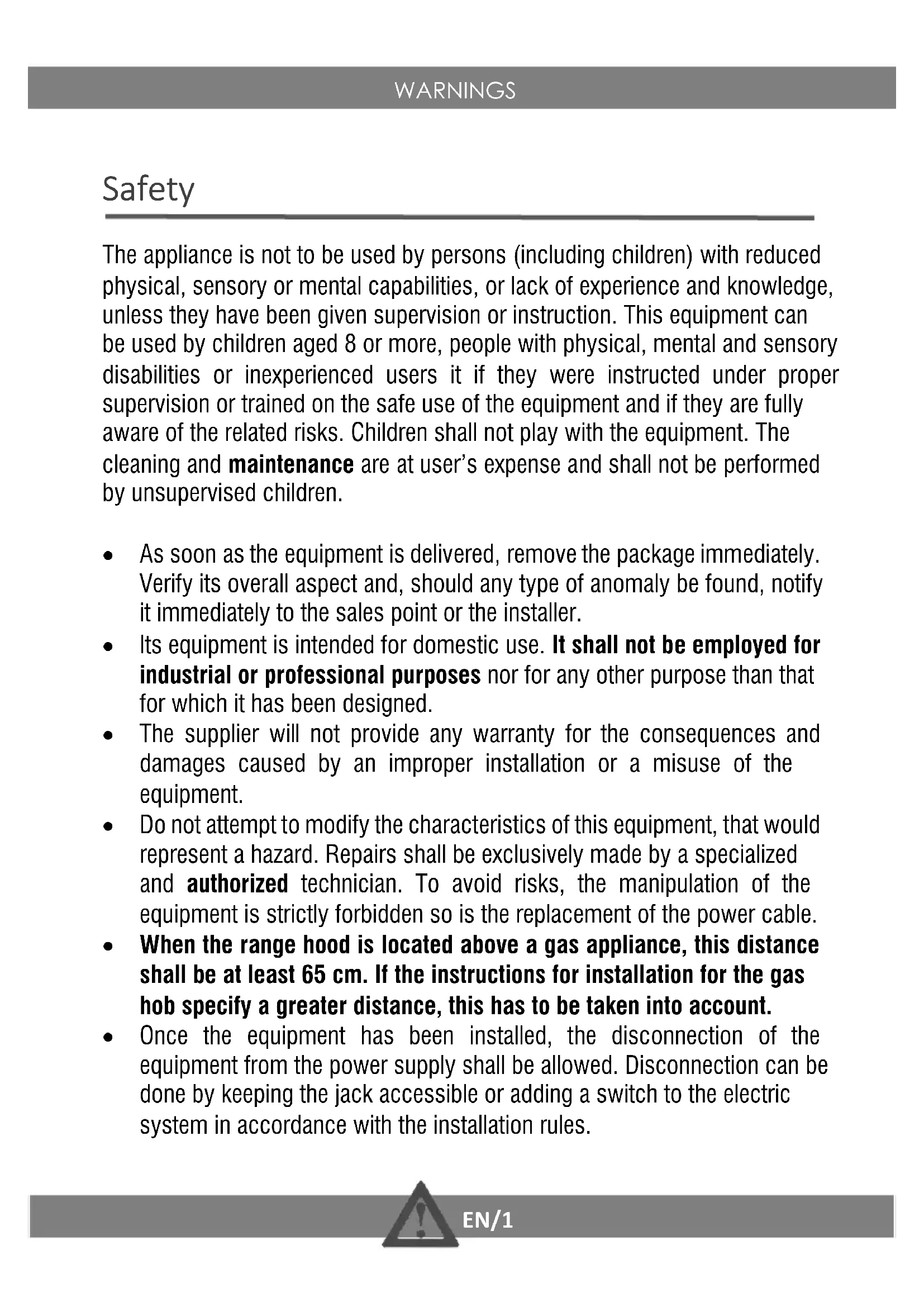 WARNINGS EN/1 Safety The appliance is not to be used by persons (including children) with reduced physical, sensory or mental capabilities, or lack of experience and knowledge, unless they have been given supervision or instruction. This equipment can be used by children aged 8 or more, people with physical, mental and sensory disabilities or inexperienced users it if they were instructed under proper supervision or trained on the safe use of the equipment and if they are fully aware of the related risks. Children shall not play with the equipment. The cleaning and maintenance are at user’s expense and shall not be performed by unsupervised children. As soon as the equipment is delivered, remove the package immediately. Verify its overall aspect and, should any type of anomaly be found, notify it immediately to the sales point or the installer. Its equipment is intended for domestic use. It shall not be employed for industrial or professional purposes nor for any other purpose than that for which it has been designed. The supplier will not provide any warranty for the consequences and damages caused by an improper installation or a misuse of the equipment. Do not attempt to modify the characteristics of this equipment, that would represent a hazard. Repairs shall be exclusively made by a specialized and authorized technician. To avoid risks, the manipulation of the equipment is strictly forbidden so is the replacement of the power cable. When the range hood is located above a gas appliance, this distance shall be at least 65 cm. If the instructions for installation for the gas hob specify a greater distance, this has to be taken into account. Once the equipment has been installed, the disconnection of the equipment from the power supply shall be allowed. Disconnection can be done by keeping the jack accessible or adding a switch to the electric system in accordance with the installation rules.WARNINGS EN/2 If the power cord is damaged, it shall be replaced either by the producer, its customer service or qualified personnel in order to avoid risks. It is of vital importance to place particular attention as to where the wall or ceiling will be perforated so as to verify the presence of hidden electrical cables, pipes or iron beams, etc. This may cause serious breakdowns, electrical derivations or the transmission of noises and vibrations. IMPORTANT: During the installation phase, before electrically connecting the equipment, always disconnect the power panel that will supply it (differential or thermal-magnetic of the general house switchboard). WARNINGS: Always disconnect the exhaust hood from the electrical outlet before proceeding to cleaning and maintenance operations by plugging off the electrical outlet, differential or thermal-magnetic of the general home switchboard. To clean the exhaust hood, never use steam or high-pressure devices (rules regarding electric safety). It is forbidden to cook directly on the flame or operate the gas stoves with no container to cook on the same flame (aspirated flames may damage the equipment and the warranty will be cancelled accordingly). The use of the equipment on a fuel stove is not authorized (wood, coal,…). Frying under the equipment shall be constantly monitored since oils and fats being subjected to high temperatures may ignite. Do not flame under the exhaust hood. CAUTION: accessible parts may become hot when used with cooking appliances. Follow the cleaning frequency and filter substitution. The accrual of fat deposits may provoke fires. Never use the exhaust hood without the anti- fat filter. The equipment shall abide by the existing rules on the ventilation of closed spaces. Technically, the air expelled shall not pass through the duct used for the discharge of smokes from appliances using gas or any other fuel (central heating systems, etc...). Ventilate the environment appropriately in case of a simultaneous operation of the exhaust hood and any other equipment supplied by anWARNINGS EN/3 energy source other than electricity so that the exhaust hood will not draw gas compounds. Attention! There shall be adequate ventilation of the room when the range hood is used at the same time as appliances burning gas or other fuels (not applicable to appliances that only discharge the air back into the room. It is necessary to maintain a depressurized environment of maximum 4 Pa (0.04 mbar). Such conditions allow an excellent working of the exhaust hood. In order to achieve such environment a permanent air intake is necessary in order to avoid air stagnation (it is advised to use a ventilation grid for this purpose). Windows or doors shall not be used. The electrical supply of the power network shall be stable and cope with the indicated electrical standards, see rating label. Should it be not stable and receive voltage variations in the supply, intensity or frequency such as armonici, transistor, voltage dips, overloads, electrical storms, etc..., the hood may show malfunctions or even breakdowns, and the repair would not be covered by the warranty. In that case, the exhaust hood shall be disconnected and the company must contact an electrician or electrical company in order to solve the supply problem. The hood is a household appliance act to extract smoke , it can not be used as support element of objects or utensils. In the constant effort to to improve our products, we reserve the right to make changes following their enhancement to their technical, functional and aesthetic characteristics. Declaration of Conformity CE This appliance is in compliance with the following European Directives: Directive EMC 2014/30/EU Directive LVD 2014/35/EU Directive ROHS 2011/65/EU Delegated Regulation ( UE ) nr. 65/2014WARNINGS EN/4 Electrical Connection Before connecting the appliance to the electricity supply, check that the voltage corresponds to that on the data plate and that the power supply cable is suitable for the appliance load also stated on th
