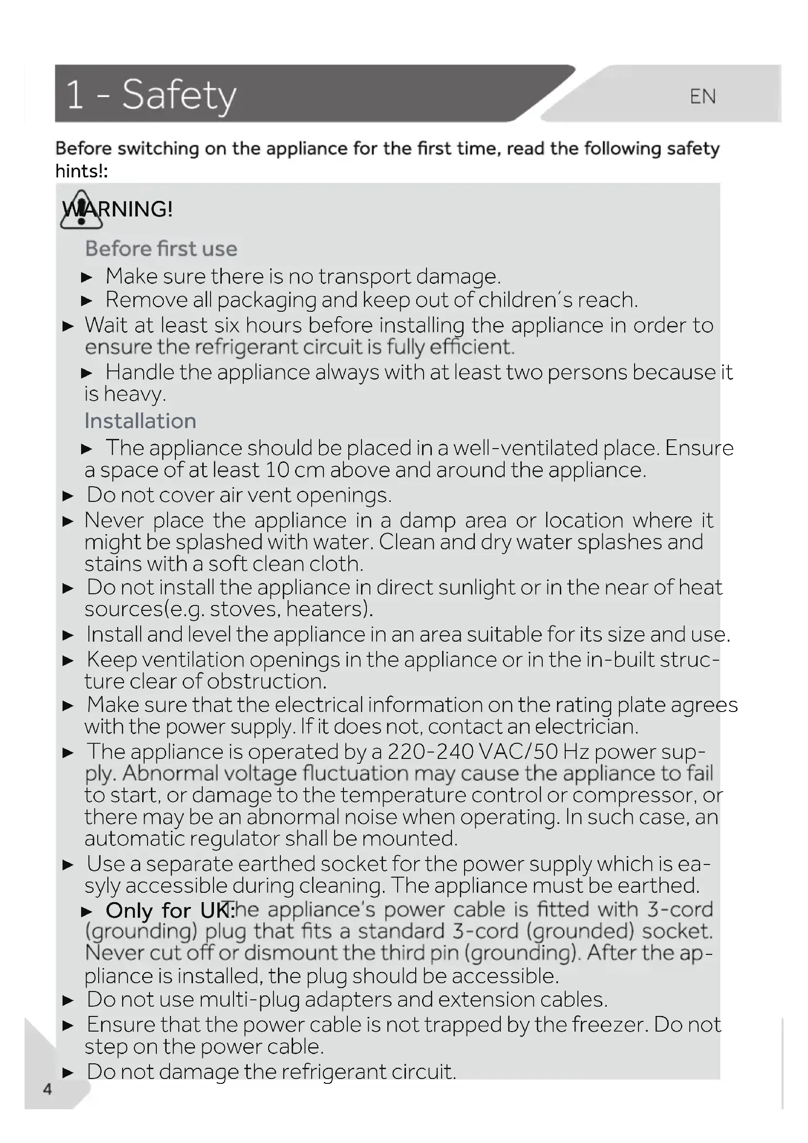 - 12 - Customer Service WARNING! ▶ Make sure there is no transport damage. ▶ Remove all packaging and keep out of children´s reach. ▶ Wait at least six hours before installing the appliance in order to ▶ Handle the appliance always with at least two persons because it is heavy. Installation ▶ The appliance should be placed in a well-ventilated place. Ensure a space of at least 10 cm above and around the appliance. ▶ Do not cover air vent openings. ▶ Never place the appliance in a damp area or location where it might be splashed with water. Clean and dry water splashes and stains with a soft clean cloth. ▶ Do not install the appliance in direct sunlight or in the near of heat sources(e.g. stoves, heaters). ▶ Install and level the appliance in an area suitable for its size and use. ▶ Keep ventilation openings in the appliance or in the in-built struc- ture clear of obstruction. ▶ Make sure that the electrical information on the rating plate agrees with the power supply. If it does not, contact an electrician. ▶ The appliance is operated by a 220-240 VAC/50 Hz power sup- to start, or damage to the temperature control or compressor, or there may be an abnormal noise when operating. In such case, an automatic regulator shall be mounted. ▶ Use a separate earthed socket for the power supply which is ea- syly accessible during cleaning. The appliance must be earthed. ▶ Only for UK: p. 25