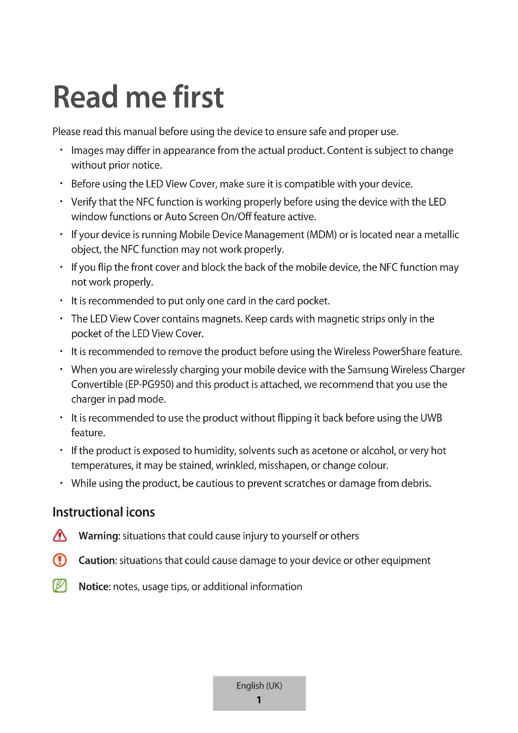 Caution: situations that could cause damage to your device or other equipment Notice: notes, usage tips, or additional information English (UK)