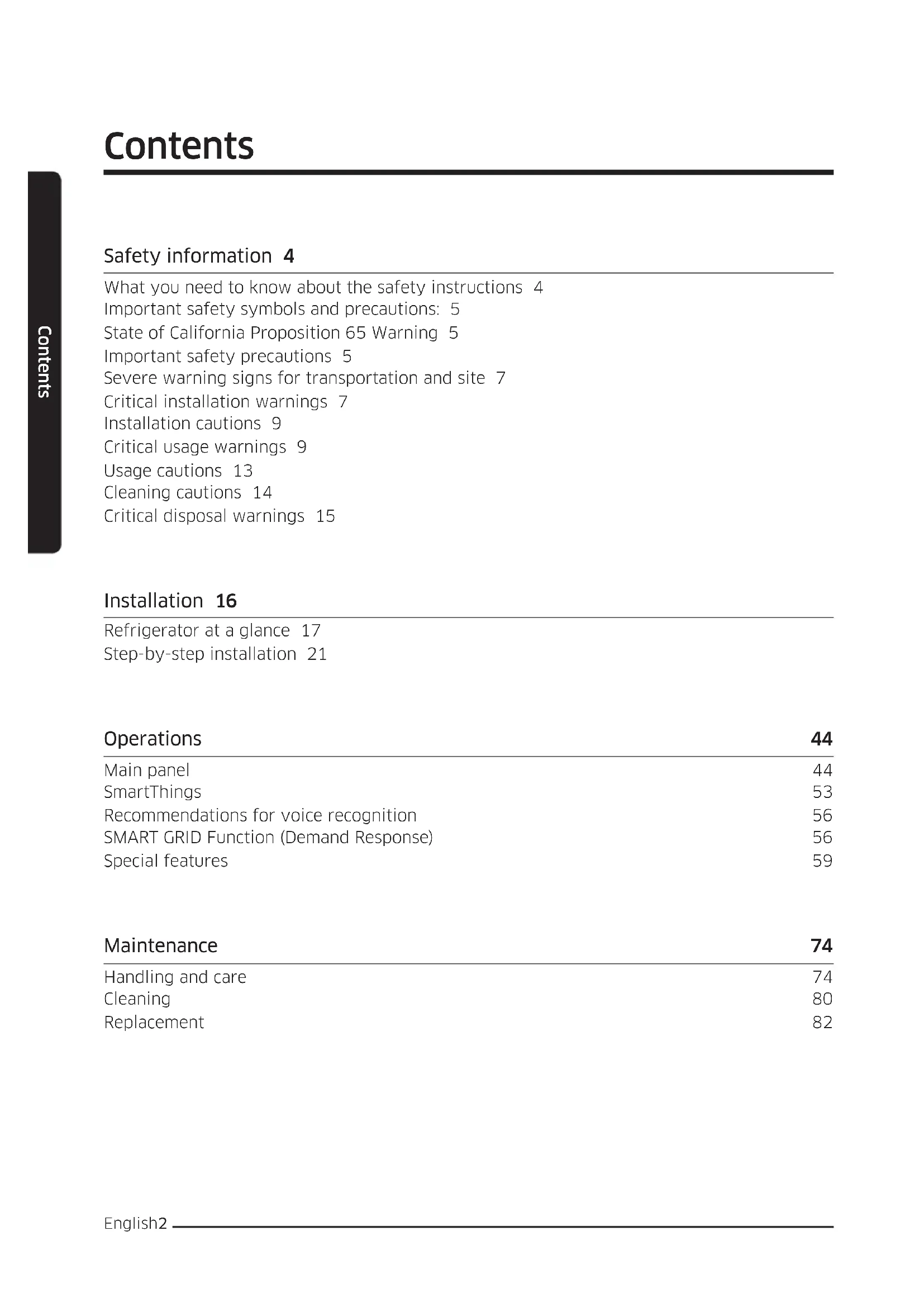 Refrigerator User manual Free Standing ApplianceEnglish2 Contents Contents Safety information 4 What you need to know about the safety instructions 4 Important safety symbols and precautions: 5 State of California Proposition 65 Warning 5 Important safety precautions 5 Severe warning signs for transportation and site 7 Critical installation warnings 7 Installation cautions 9 Critical usage warnings 9 Usage cautions 13 Cleaning cautions 14 Critical disposal warnings 15 Installation 16 Refrigerator at a glance 17 Step-by-step installation 21 Operations 44 Main panel 44 SmartThings 53 Recommendations for voice recognition 56 SMART GRID Function (Demand Response) 56 Special features 59 Maintenance 74 Handling and care 74 Cleaning 80 Replacement 82English 3 Contents Troubleshooting 85 General 85 Do you hear abnormal sounds from the refrigerator? 91 SmartThings 93 LCD 94 Smart Grid 95