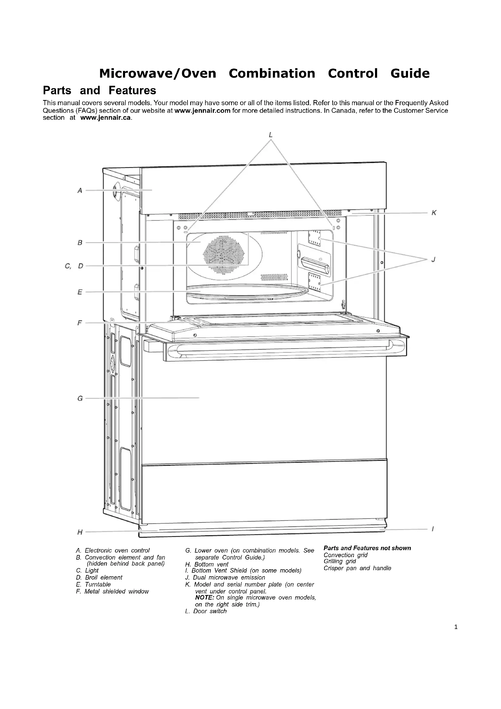 Microwave/Oven Combination Control Guide Parts and Features This manual covers several models. Your model may have some or all of the items listed. Refer to this manual or the Frequently Asked Questions (FAQs) section of our website at www.jennair.com for more detailed instructions. In Canada, refer to the Customer Service section at www.jennair.ca. A. Electronic oven control B. Convection element and fan (hidden behind back panel) C. Light D. Broil element E. Turntable F. Metal shielded window G. Lower oven (on combination models. See separate Control Guide.) H. Bottom vent