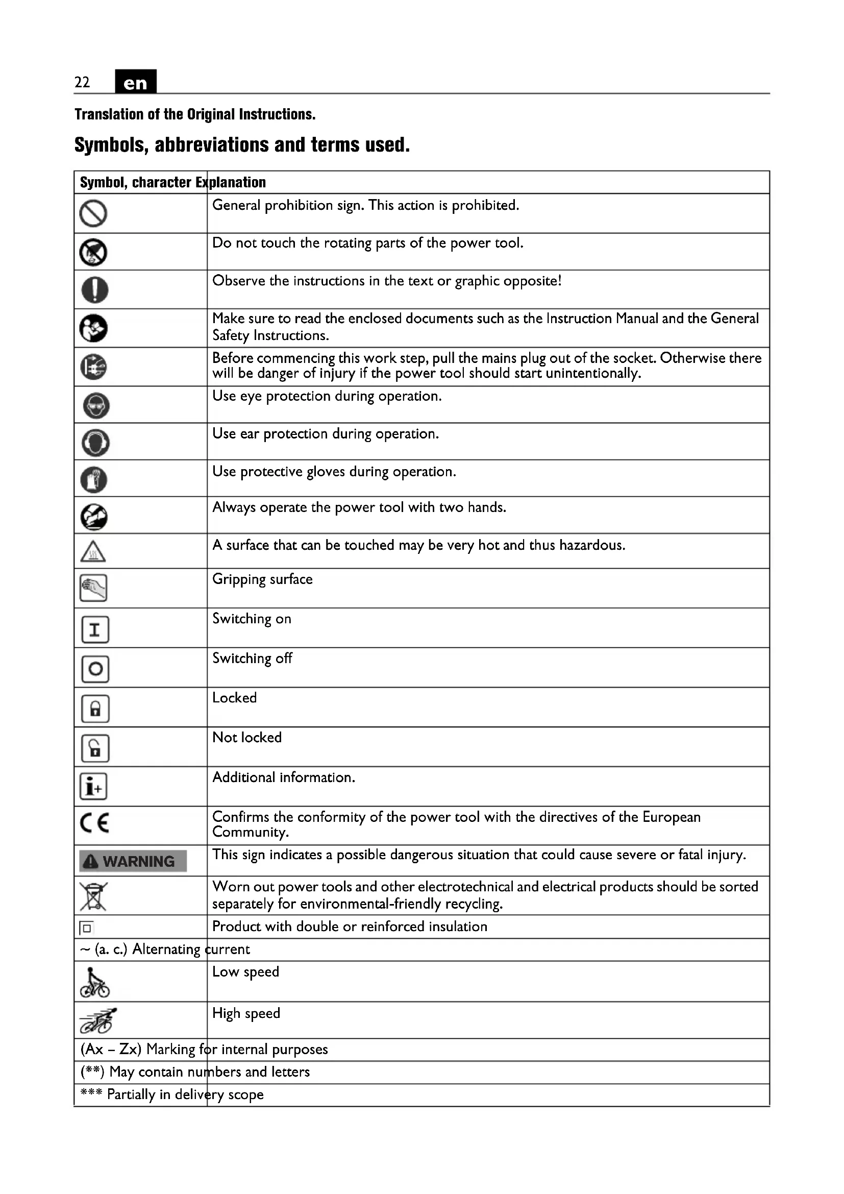 Translation of the Original Instructions. Symbols, abbreviations and terms used. Symbol, character Explanation General prohibition sign. This action is prohibited. Do not touch the rotating parts of the power tool. Observe the instructions in the text or graphic opposite! Make sure to read the enclosed documents such as the Instruction Manual and the General Safety Instructions. Before commencing this work step, pull the mains plug out of the socket. Otherwise there will be danger of injury if the power tool should start unintentionally. Use eye protection during operation. Use ear protection during operation. Use protective gloves during operation. Always operate the power tool with two hands. A surface that can be touched may be very hot and thus hazardous. Gripping surface Switching on Switching off Locked Not locked Additional information. Confirms the conformity of the power tool with the directives of the European Community. This sign indicates a possible dangerous situation that could cause severe or fatal injury. Worn out power tools and other electrotechnical and electrical products should be sorted separately for environmental-friendly recycling. Product with double or reinforced insulation ~ (a. c.) Alternating current Low speed High speed (Ax – Zx) Marking for internal purposes (**) May contain numbers and letters *** Partially in delivery scope WARNING23