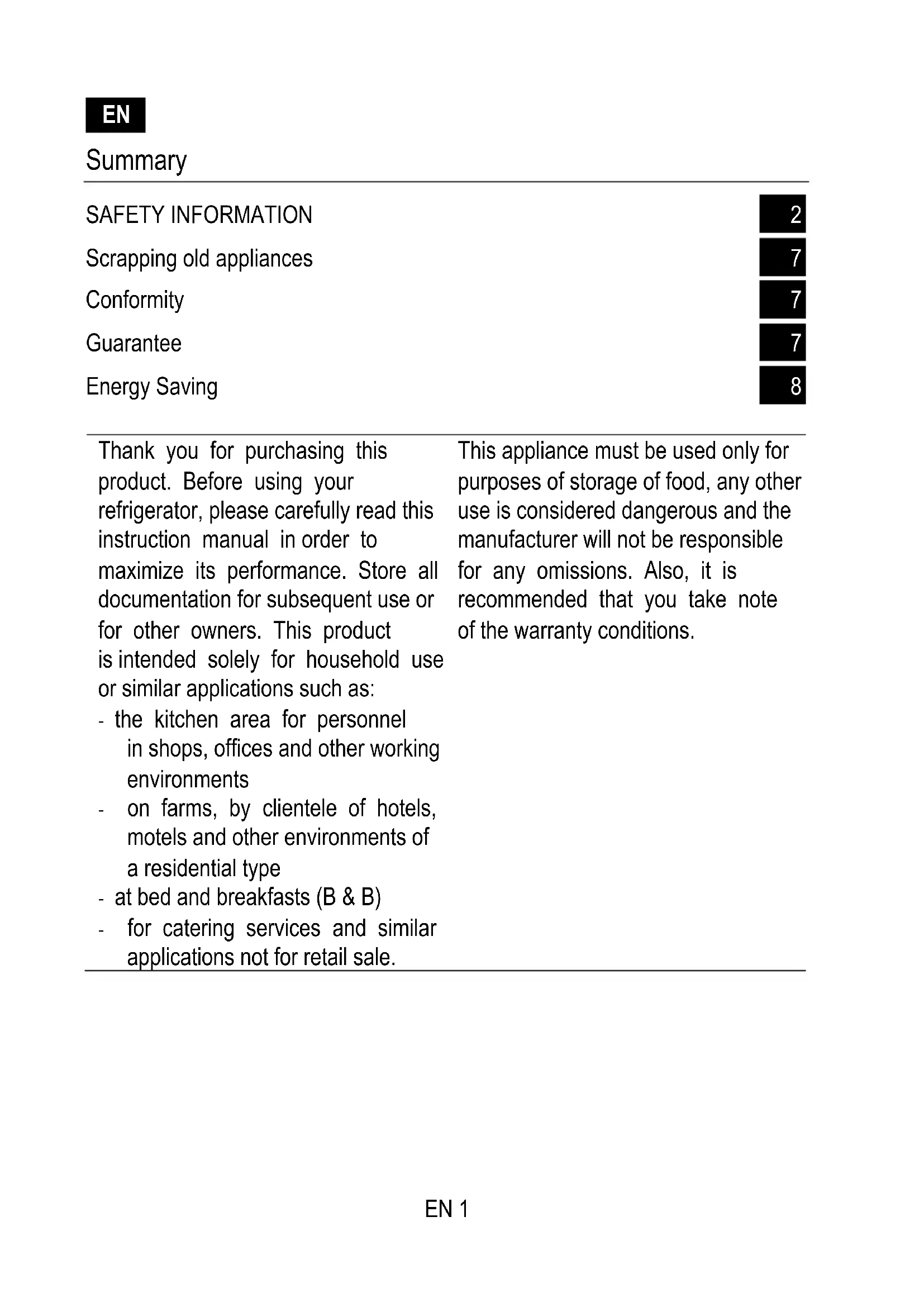 Thank you for purchasing this product. Before using your refrigerator, please carefully read this instruction manual in order to maximize its performance. Store all documentation for subsequent use or for other owners. This product is intended solely for household use or similar applications such as: - the kitchen area for personnel in shops, offices and other working environments - on farms, by clientele of hotels, motels and other environments of a residential type - at bed and breakfasts (B & B) - for catering services and similar applications not for retail sale. This appliance must be used only for purposes of storage of food, any other use is considered dangerous and the manufacturer will not be responsible for any omissions. Also, it is recommended that you take note of the warranty conditions.EN 2 SAFETY INFORMATION Please read the operating and installation instructions carefully! They contain important information on how to install, use and maintain the appliance. The manufacturer is not liable if you fail to comply with the instructions and warnings. Retain all documents for subsequent use or for the next owner.