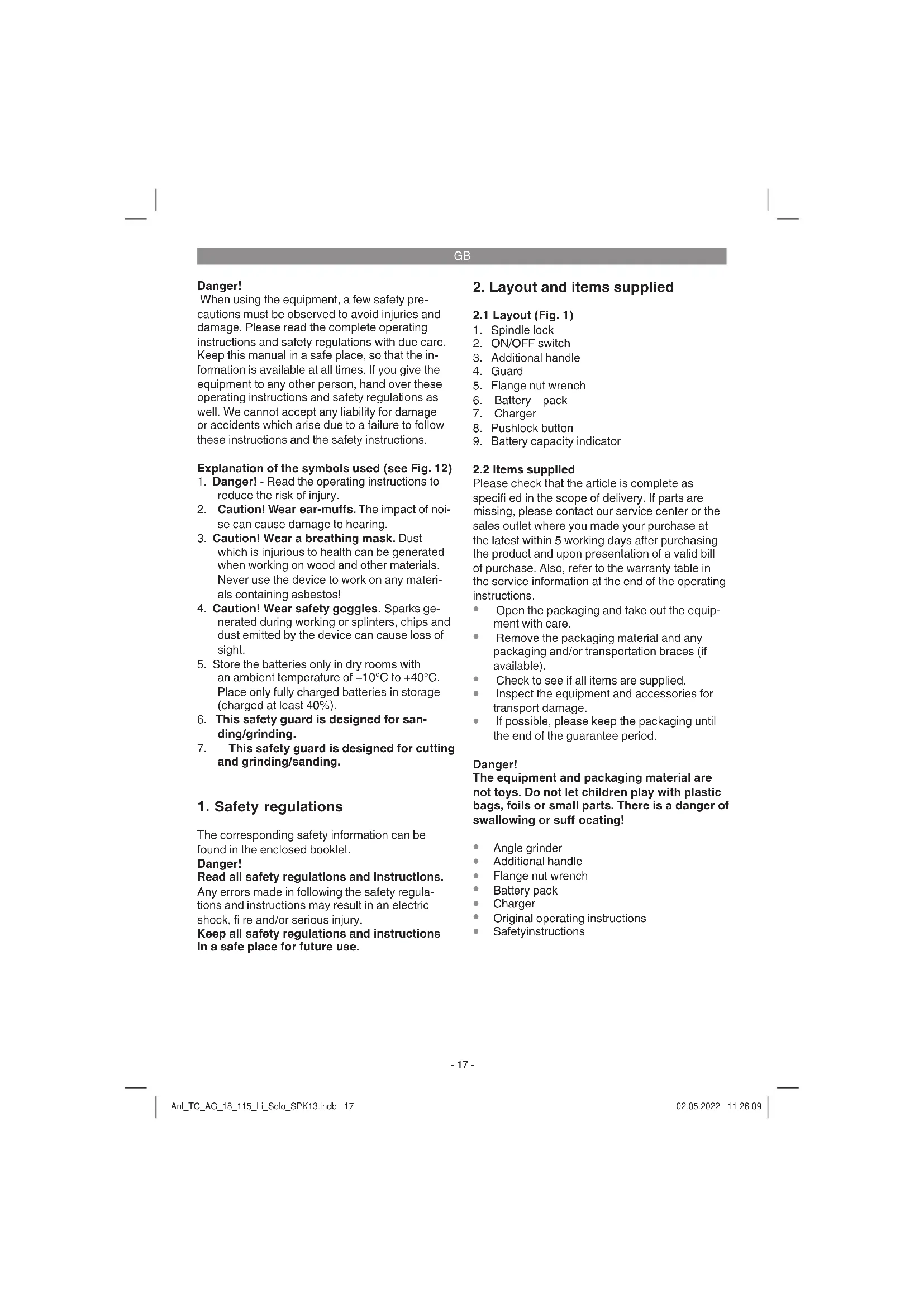 Check the direction of rotation when you use diamond cutting wheels. The directional arrow on the diamond cutting wheel must point in the direction in which the tool rotates. Take special care that the grinding/sanding wheels are properly stored and transported. Ensure that the grinding/sanding wheels are never exposed to shock, jolts or sharp edges (for example during transport or storage in a toolbox). This could cause damage (such as cracks) to the grinding/sanding wheels and place the user in serious danger. Anl_TC_AG_18_115_Li_Solo_SPK13.indb 20Anl_TC_AG_18_115_Li_Solo_SPK13.indb 20 02.05.2022 11:26:1002.05.2022 11:26:10GB