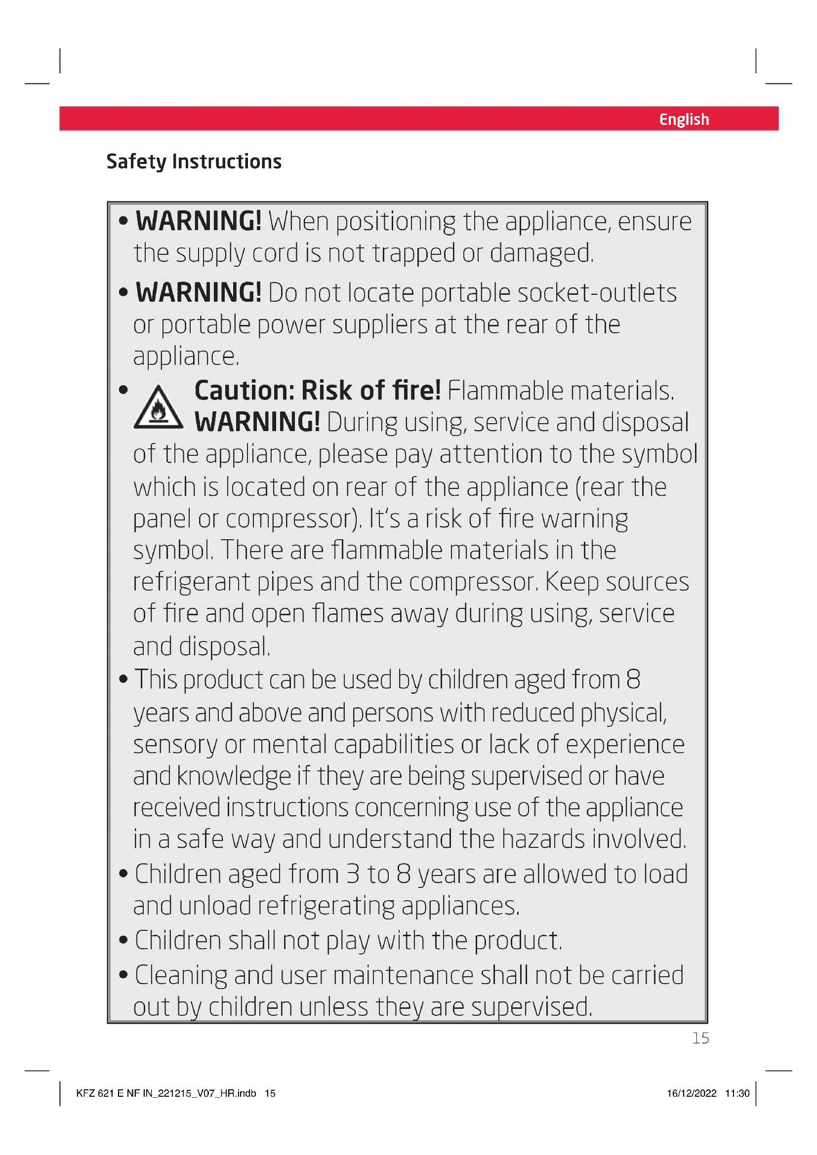 - Cleaning and user maintenance shall not be carried out by children unless they are supervised. KFZ 621 E NF IN_221215_V07_HR.indb 15KFZ 621 E NF IN_221215_V07_HR.indb 15 16/12/2022 11:3016/12/2022 11:30English