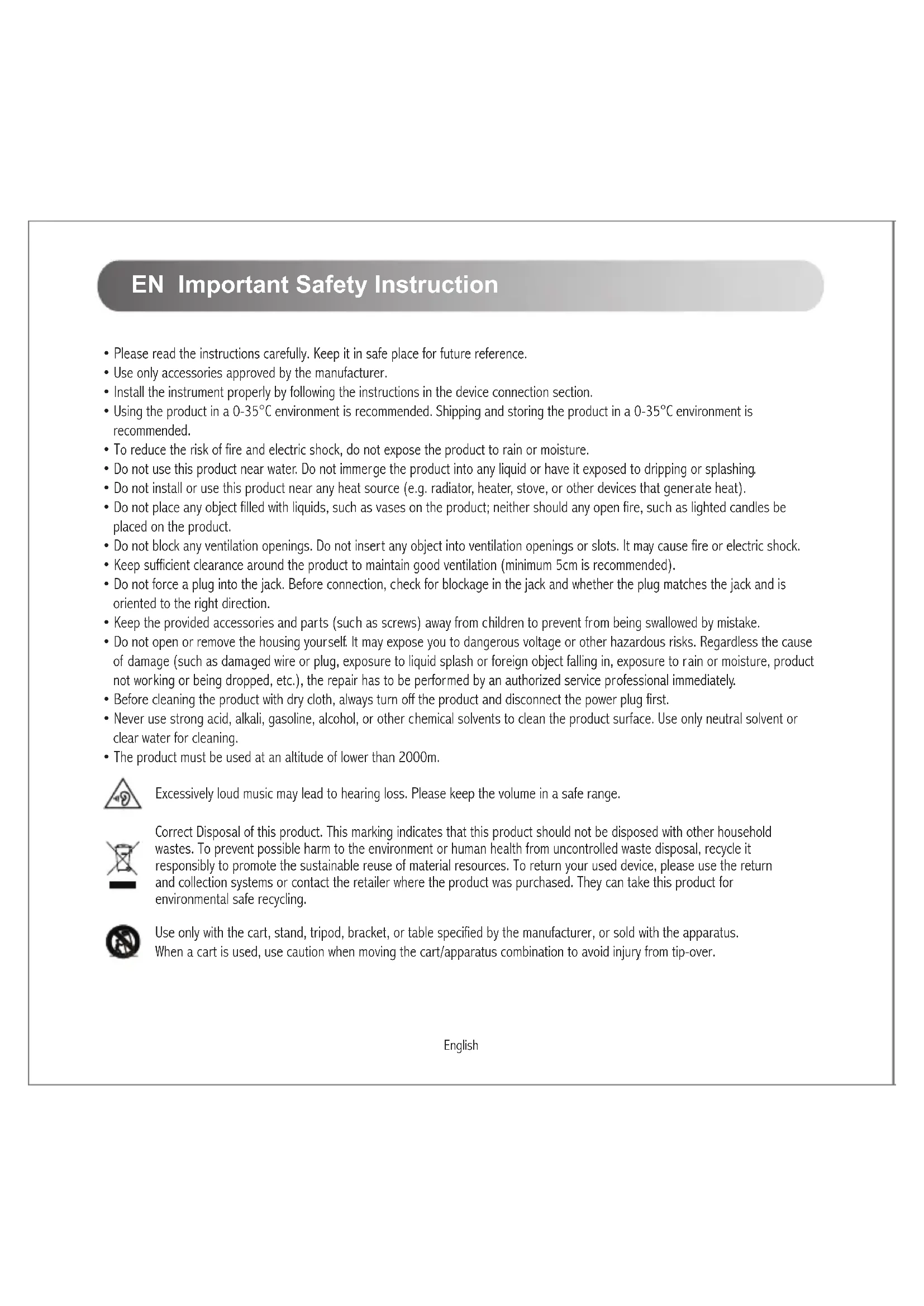 - The product must be used at an altitude of lower than 2000m. Excessively loud music may lead to hearing loss. Please keep the volume in a safe range. Correct Disposal of this product. This marking indicates that this product should not be disposed with other household wastes. To prevent possible harm to the environment or human health from uncontrolled waste disposal, recycle it responsibly to promote the sustainable reuse of material resources. To return your used device, please use the return and collection systems or contact the retailer where the product was purchased. They can take this product for environmental safe recycling. Use only with the cart, stand, tripod, bracket, or table specified by the manufacturer, or sold with the apparatus. When a cart is used, use caution when moving the cart/apparatus combination to avoid injury from tip-over.Important Safety Instruction The MAINS plug is used as the disconnect device, the disconnect device shall remain readily operable. For wireless product: 1. Wireless product may generate shortwave radio frequencies and interfere with the normal use of other electronic devices or medical equipment. 2. Turn off the product when it’s disallowed. Do not use the product in medical facilities, on airplane, at gas stations, near automatic gates, automatic fire alarm system or other automated devices. 3. Do not use the product in the vicinity of a pacemaker within a 20cm range. The radio waves may affect the normal operation of the pacemaker or other medical devices. Power warning: