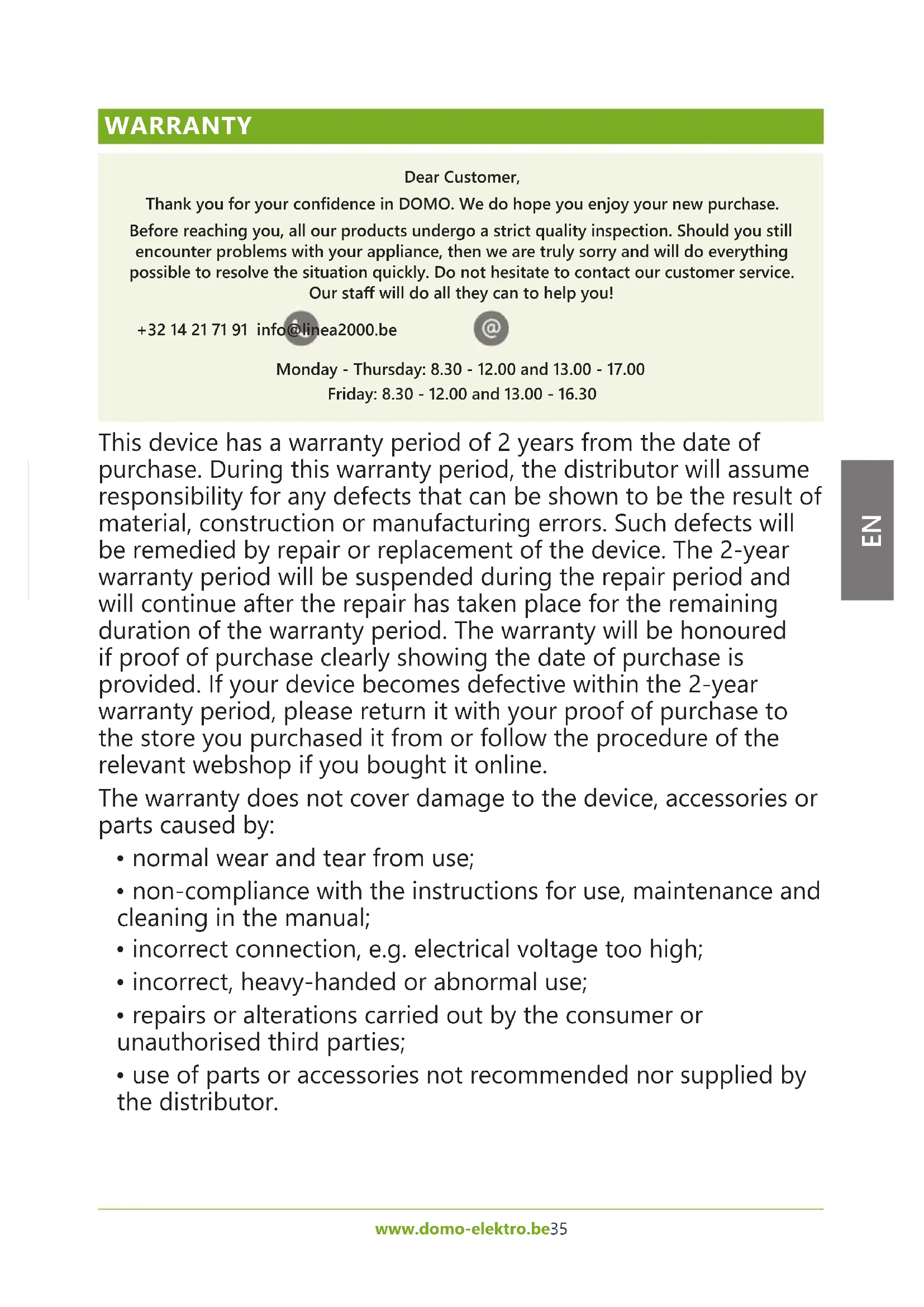 WARRANTY Dear Customer, Thank you for your condence in DOMO. We do hope you enjoy your new purchase. Before reaching you, all our products undergo a strict quality inspection. Should you still encounter problems with your appliance, then we are truly sorry and will do everything possible to resolve the situation quickly. Do not hesitate to contact our customer service. Our sta will do all they can to help you! +32 14 21 71 91 info@linea2000.be Monday - Thursday: 8.30 - 12.00 and 13.00 - 17.00 Friday: 8.30 - 12.00 and 13.00 - 16.30 This device has a warranty period of 2 years from the date of purchase. During this warranty period, the distributor will assume responsibility for any defects that can be shown to be the result of material, construction or manufacturing errors. Such defects will be remedied by repair or replacement of the device. The 2-year warranty period will be suspended during the repair period and will continue after the repair has taken place for the remaining duration of the warranty period. The warranty will be honoured if proof of purchase clearly showing the date of purchase is provided. If your device becomes defective within the 2-year warranty period, please return it with your proof of purchase to the store you purchased it from or follow the procedure of the relevant webshop if you bought it online. The warranty does not cover damage to the device, accessories or parts caused by: