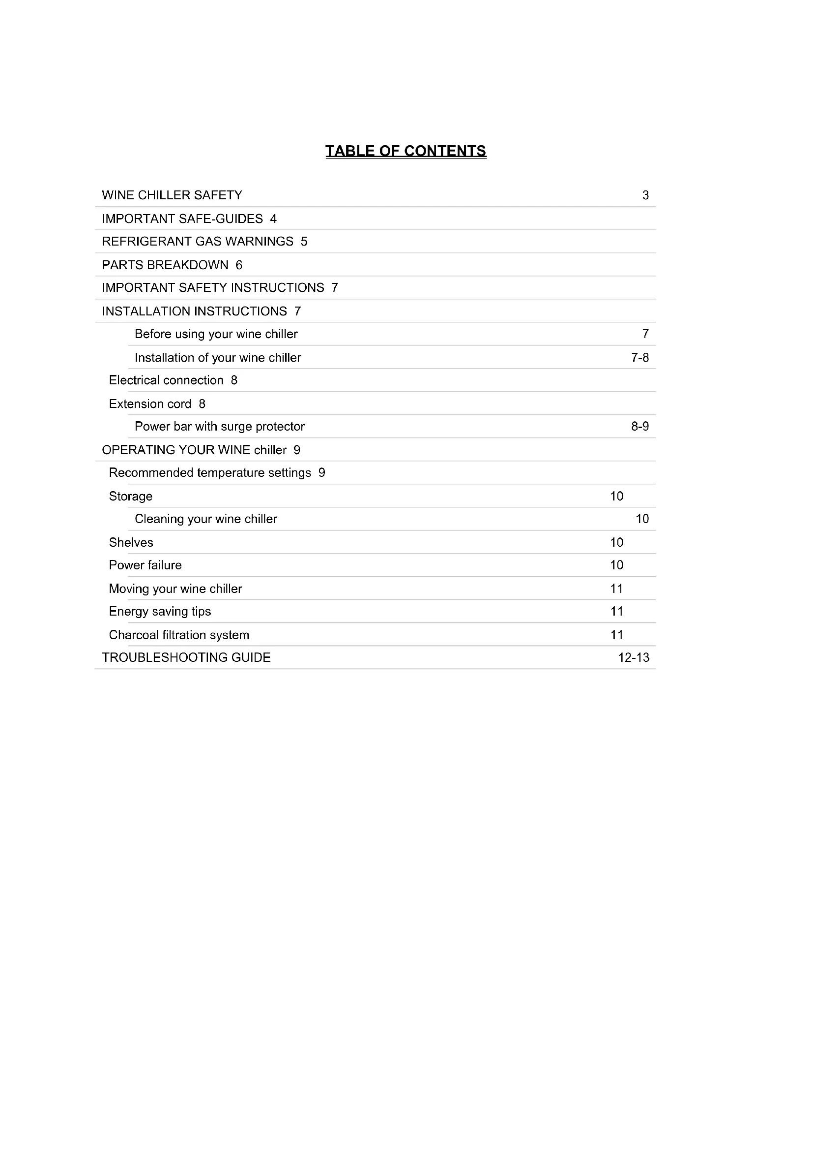 INSTALLATION INSTRUCTIONS 7 Before using your wine chiller 7 Installation of your wine chiller 7-8 Electrical connection 8 Extension cord 8 Power bar with surge protector 8-9 OPERATING YOUR WINE chiller 9 Recommended temperature settings 9 Storage 10 Cleaning your wine chiller 10 Shelves 10 Power failure 10 Moving your wine chiller 11 Energy saving tips 11 Charcoal filtration system 11