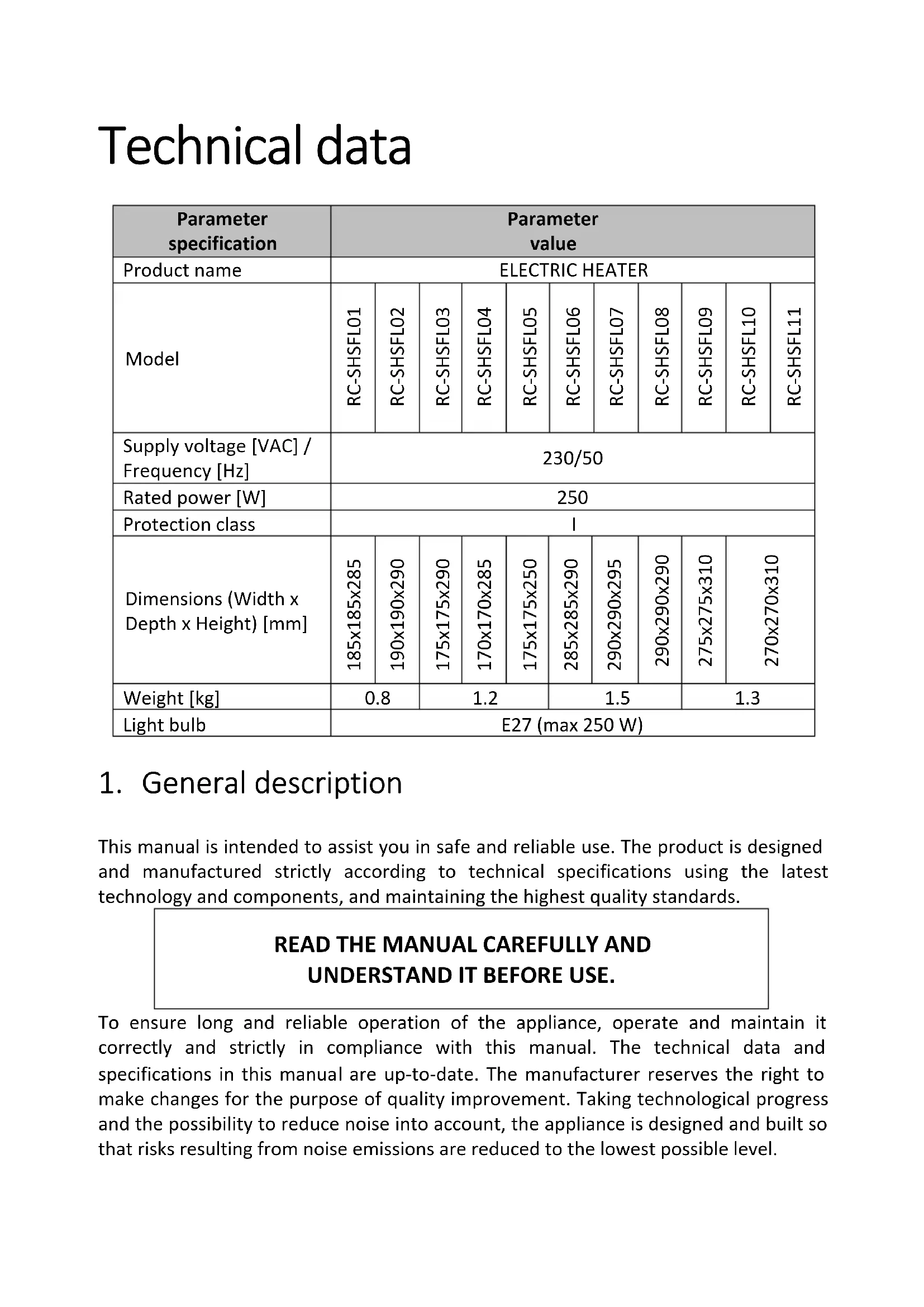 At the end of its service life, this product must not be disposed of with mixed household waste; return it to a collector/recycler of waste electrical and electronic equipment. This is shown by the symbol placed on the product, the user manual or the packaging. The materials used in the appliance can be reused according to their classification identifications. By reuse, recycling or applying other forms of use of waste appliances, you make a significant contribution to the protection of our environment. Local administration will provide you with the information about the nearest disposal locations for the appliance. TROUBLESHOOTING Problem Possible cause Action The appliance does not work. The appliance is not turned on. Make sure that the appliance is properly connected to the mains and turned on. Power cord/cable failure. Have an electrician repair the failure. The light bulb is not screwed all the way in or has failed. Screw it all the way in or replace.Mains power lost. Check the fuses/circuit breakers.Dane techniczne Opis parametru Wartość parametru Nazwa produktu GRZEJNIK ELEKTRYCZNY Model RC-SHSFL01 RC-SHSFL02 RC-SHSFL03 RC-SHSFL04 RC-SHSFL05 RC-SHSFL06 RC-SHSFL07 RC-SHSFL08 RC-SHSFL09 RC-SHSFL10 RC-SHSFL11 Napięcie zasilania [V~] / Częstotliwość [Hz] 230/50 Moc znamionowa [W]