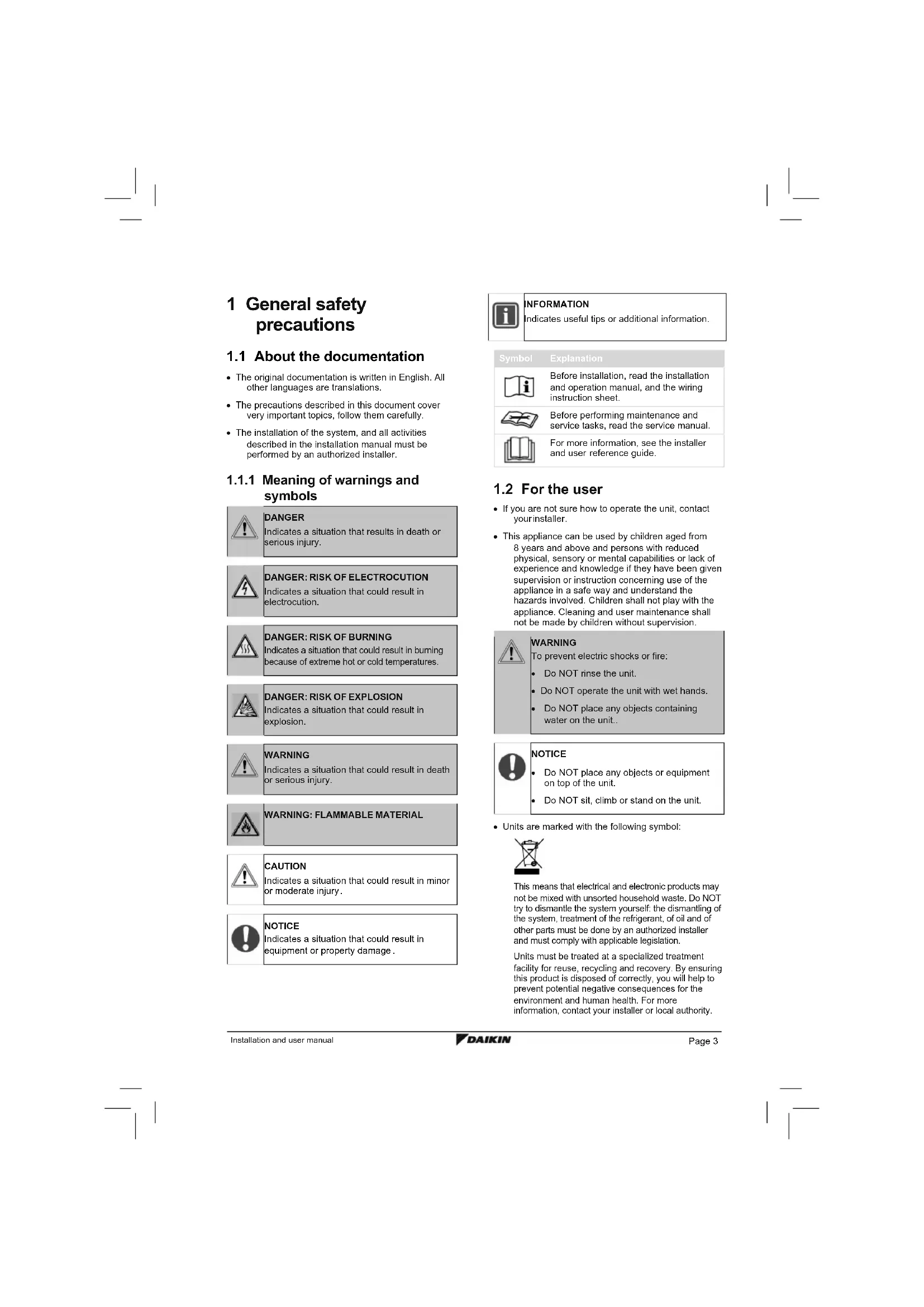 This means that electrical and electronic products may not be mixed with unsorted household waste. Do NOT try to dismantle the system yourself: the dismantling of the system, treatment of the refrigerant, of oil and of other parts must be done by an authorized installer and must comply with applicable legislation. Units must be treated at a specialized treatment facility for reuse, recycling and recovery. By ensuring this product is disposed of correctly, you will help to prevent potential negative consequences for the environment and human health. For more information, contact your installer or local authority.Page