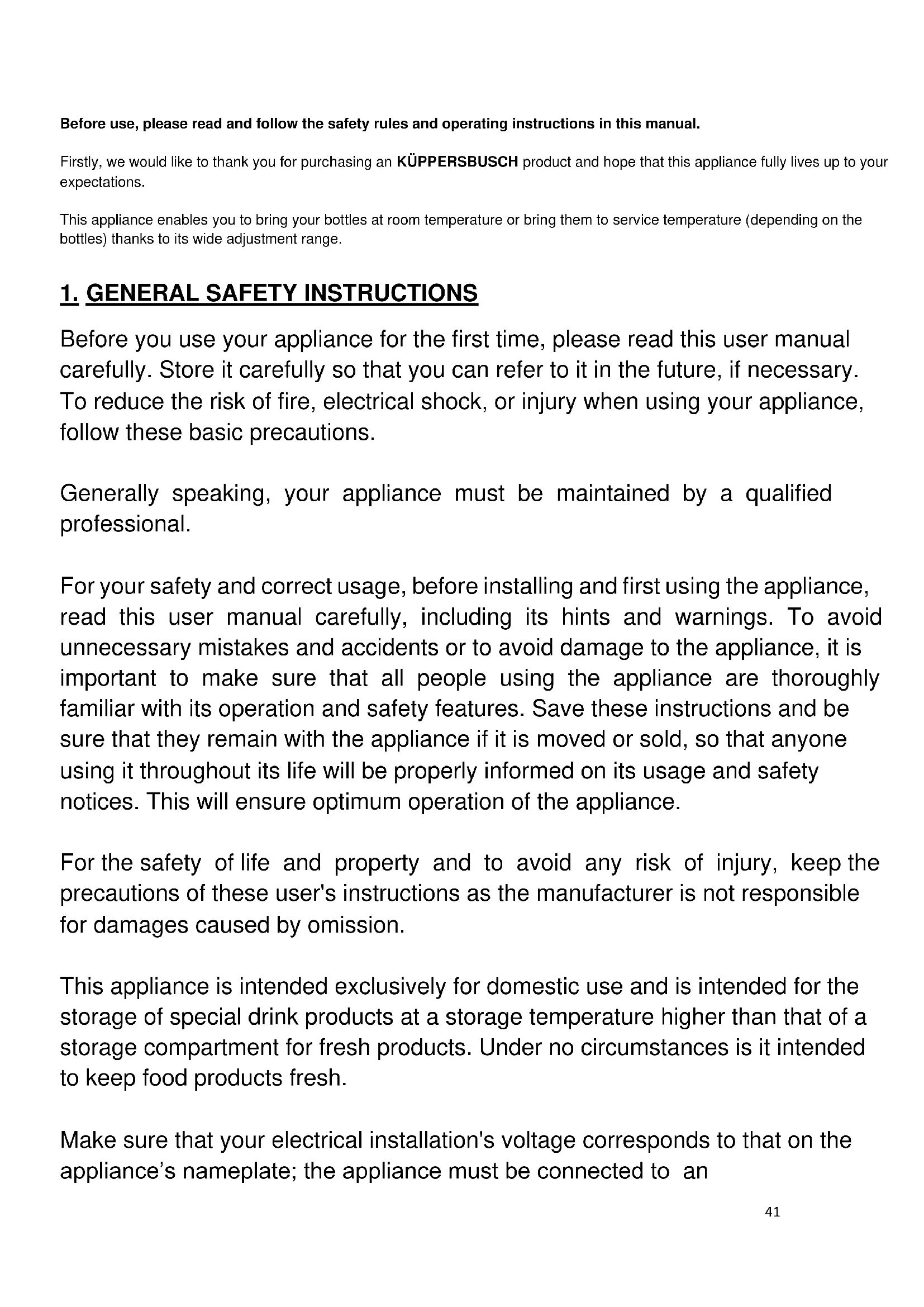 Before use, please read and follow the safety rules and operating instructions in this manual. Firstly, we would like to thank you for purchasing an KÜPPERSBUSCH product and hope that this appliance fully lives up to your expectations. This appliance enables you to bring your bottles at room temperature or bring them to service temperature (depending on the bottles) thanks to its wide adjustment range.