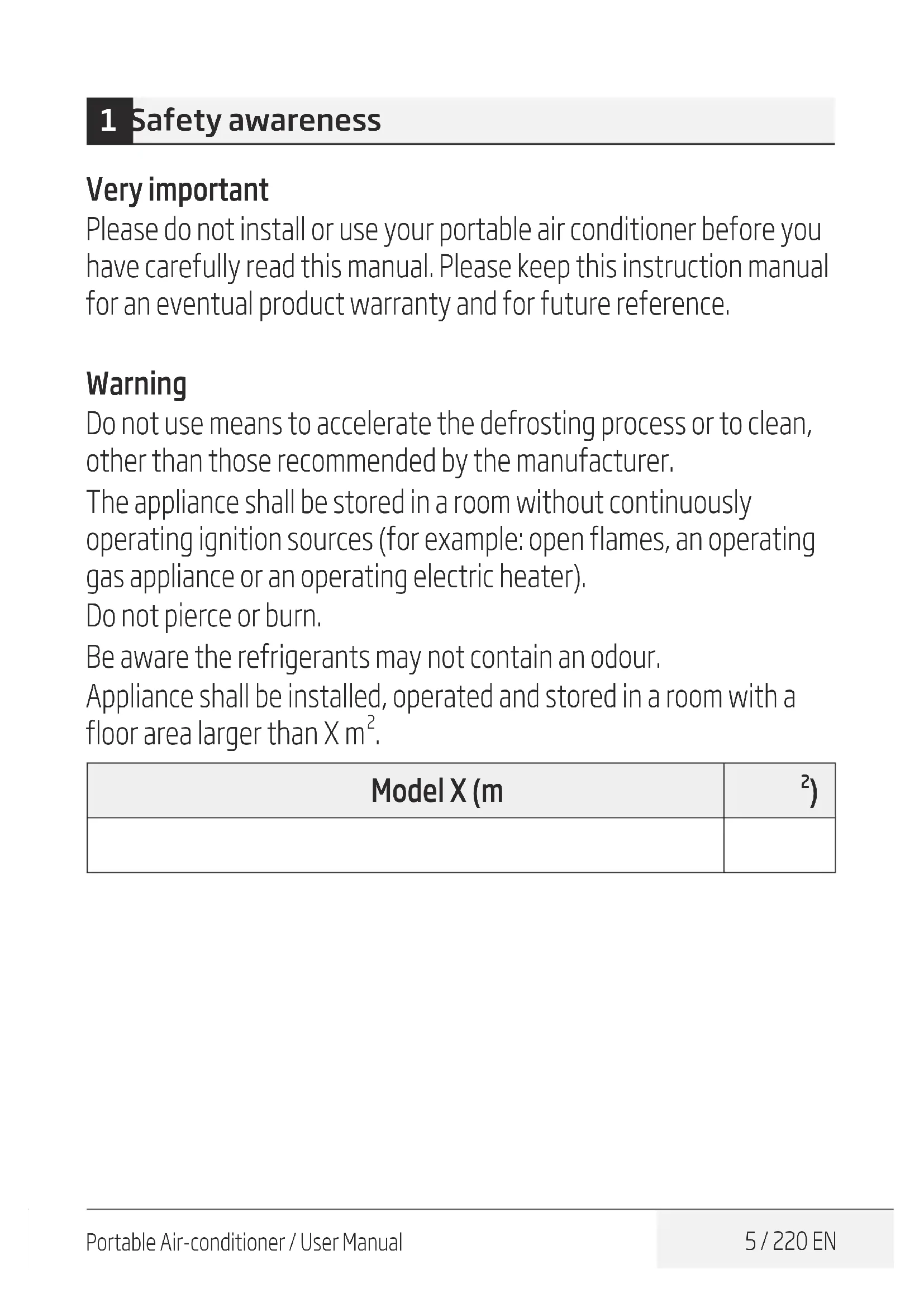 Under no circumstances shall potential sources of ignition be used in the searching for or detection of refrigerant leaks. A halide torch (or any other detector using a naked flame) shall not be used. 1 Safety awarenessPortable Air-conditioner / User Manual 17 / 220 EN