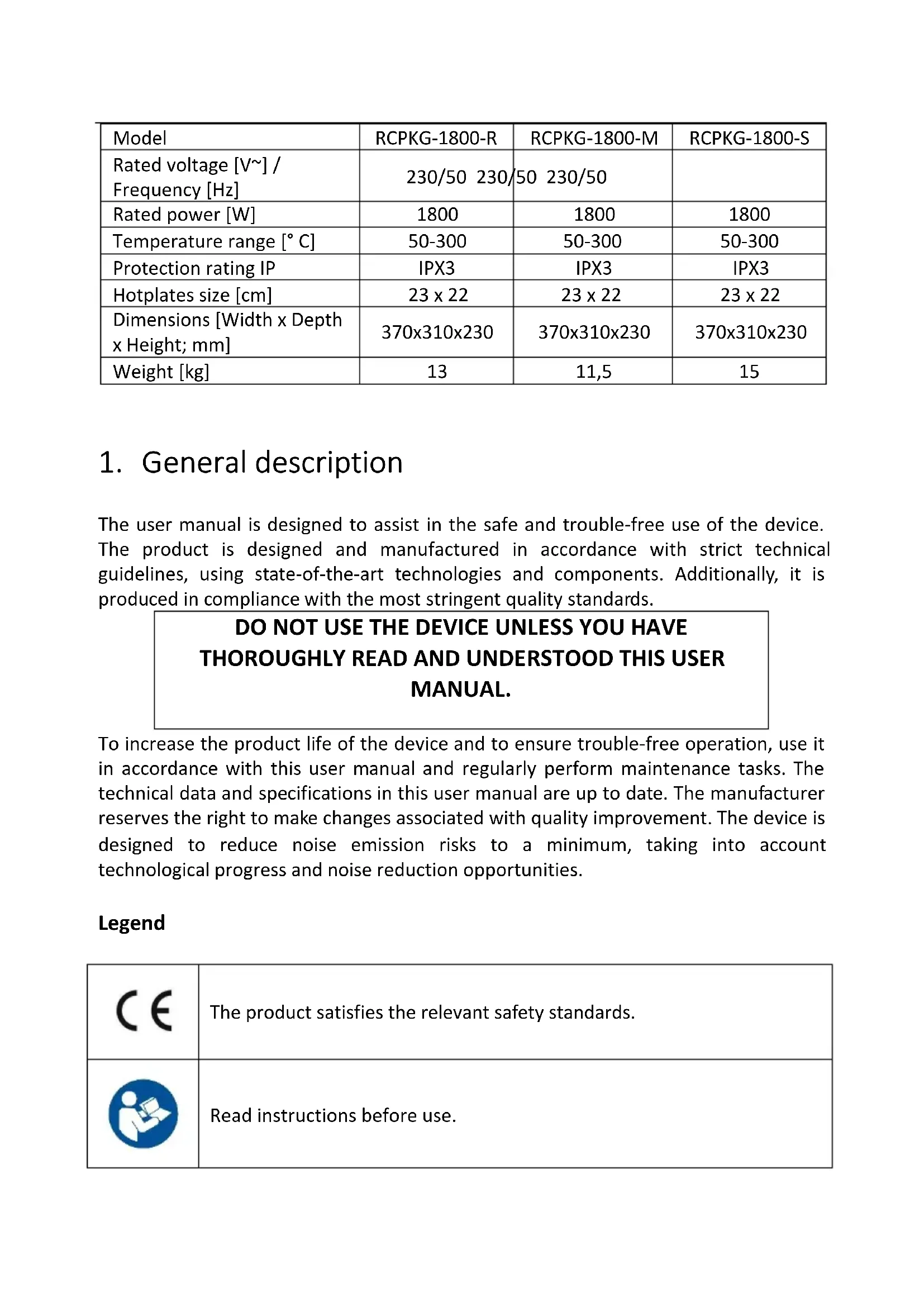 ATTENTION! Read all safety warnings and all instructions. Failure to follow the warnings and instructions may result in electric shock, fire and/or serious injury or even death. The terms "device" or "product" are used in the warnings and instructions to refer to CONTACT GRIDDLE RIBED, CONTACT GRIDDLE MIXED, CONTACT GRIDDLE FLAT. 2.1. Electrical safety a) The plug must fit the socket. Do not modify the plug in any way. Using original plugs and matching sockets reduces the risk of electric shock.b) Avoid touching earthed elements such as pipes, heaters, boilers and refrigerators. There is an increased risk of electric shock if the earthed device is exposed to rain, comes into direct contact with a wet surface or is operating in a damp environment. Water getting into the device increases the risk of damage to the device and of electric shock. c) Do not touch the device with wet or damp hands. d) Use the cable only for its designated use. Never use it to carry the device or to pull the plug out of a socket. Keep the cable away from heat sources, oil, sharp edges or moving parts. Damaged or tangled cables increase the risk of electric shock. e) If using the device in a damp environment cannot be avoided, a residual current device (RCD) should be applied. The use of an RCD reduces the risk of electric shock. f) Do not use the device if the power cord is damaged or shows obvious signs of wear. A damaged power cord should be replaced by a qualified electrician or the manufacturer‘s service centre. g) ATTENTION! DANGER TO LIFE! While cleaning, never immerse the device in water or other liquids. h) When the device is no longer used, switch it off and pull the plug out of the socket. 2.2. Safety in the workplace a) Make sure the workplace is clean and well lit. A messy or poorly lit workplace may lead to accidents. Try to think ahead, observe what is going on and use common sense when working with the device. b) Do not use the device in a potentially explosive environment, for example in the presence of flammable liquids, gases or dust. c) If you discover damage or irregular operation, immediately switch the device off and report it to a supervisor without delay. d) If there are any doubts as to the correct operation of the device, contact the manufacturer‘s support service. e) Only the manufacturer‘s service point may repair the device. Do not attempt any repairs independently! f) In case of fire, use a powder or carbon dioxide (CO2) fire extinguisher (one intended for use on live electrical devices) to put it out. g) Children or unauthorised persons are forbidden to enter a work station. h) Use the device in a well-ventilated space.