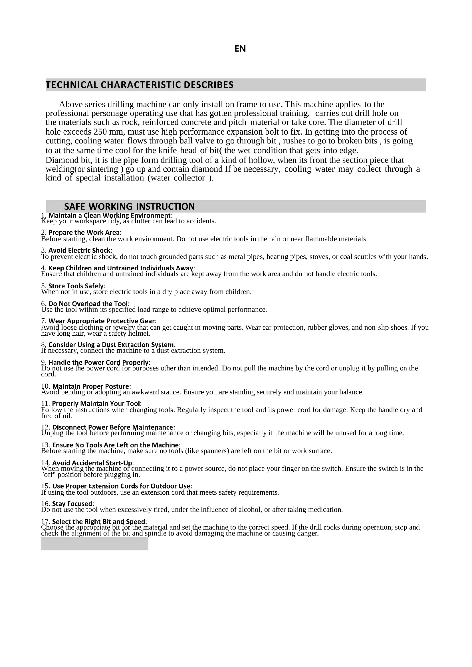Choose the appropriate bit for the material and set the machine to the correct speed. If the drill rocks during operation, stop and check the alignment of the bit and spindle to avoid damaging the machine or causing danger.EN Installation and Operation Instructions for Diamond Drilling Machine Important Note: Before beginning any installation, ensure that the main power switch is in the "OFF" position. Step 1: Inspection